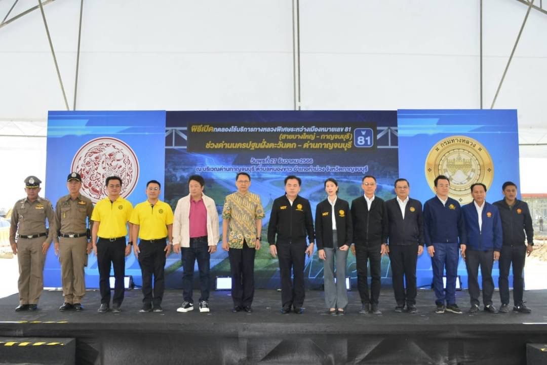 นายสุรพงษ์ ปิยะโชติ รัฐมนตรีช่วยว่าการกระทรวงคมนาคม กล่าวว่า กระทรวงคมนาคม โดยกรมทางหลวง ได้ดำเนินการพัฒนาโครงข่ายทางหลวงพิเศษระหว่างเมือง โดยเฉพาะอย่างยิ่ง ทางหลวงพิเศษระหว่างเมืองหมายเลข 81 สายบางใหญ่- กาญจนบุรี เพื่อเติมเต็มโครงข่ายทางหลวงพิเศษระหว่างเมือง เพิ่มความสะดวก รวดเร็ว และปลอดภัยให้กับประชาชนในการเดินทางและขนส่งสินค้าจากกรุงเทพฯ และปริมณฑล ไปสู่เขตพัฒนาเศรษฐกิจพิเศษจังหวัดกาญจนบุรี และภาคตะวันตกของประเทศ ส่งเสริมการค้า การลงทุน การท่องเที่ยว และเพิ่มขีดความสามารถทางการแข่งขันของไทยบนเวทีโลก ซึ่งเป็นไปตามนโยบายรัฐบาล นายเศรษฐา ทวีสิน นายกรัฐมนตรี และนายสุริยะ จึงรุ่งเรืองกิจ รัฐมนตรีว่าการกระทรวงคมนาคม ในการเดินหน้าขับเคลื่อนนโยบาย “คมนาคมเพื่อความอุดมสุขของประชาชน” โดยวันนี้ทางหลวงพิเศษระหว่างเมืองหมายเลข 81 (สายบางใหญ่ – กาญจนบุรี) พร้อมเปิดให้บริการในช่วงด่านนครปฐมฝั่งตะวันตก ตำบลวังตะกู อำเภอเมือง จังหวัดนครปฐม ตัดกับทางหลวงหมายเลข 321 ที่ กม.6+200 จนถึง ด่านกาญจนบุรี ตำบลหนองขาว อำเภอท่าม่วง จังหวัดกาญจนบุรี ตัดกับทางหลวง หมายเลข 324 ที่ กม.8+400 ระยะเวลา 7 วัน ตลอด 24 ชั่วโมง ตั้งแต่ 27 ธันวาคม 2566 – 3 มกราคม 2567 โดยไม่เก็บค่าธรรมเนียมผ่านทาง เพื่ออำนวยความสะดวกให้แก่ประชาชน โดยเฉพาะอย่างยิ่งพี่น้องประชาชนชาวกาญจนบุรี และจังหวัดใกล้เคียง ที่จะสามารถเดินทางในช่วงปีใหม่ได้อย่างสะดวกรวดเร็วมากยิ่งขึ้น นับเป็นของขวัญปีใหม่ที่กระทรวงคมนาคมมอบให้แด่พี่น้องประชาชน และเป็นการส่งเสริมการท่องเที่ยวจังหวัดกาญจนบุรีและภาคตะวันตกได้เป็นอย่างดี หากเดินทางด้วยเส้นทางดังกล่าวจะใช้เวลาเพียง 30 นาที เมื่อเปรียบเทียบกับ ทางหลวงแผ่นดินปกติ (ทล.4 และ ทล.323) ซึ่งใช้เวลาประมาณ 1 ชั่วโมง 10 นาที ทั้งนี้ บริเวณด่านเก็บเงินค่าผ่านทาง จะมีการกั้นแนว Barrier ชั่วคราว ทั้ง 2 ทิศทาง เพื่อกั้นขอบเขตระหว่างพื้นที่ก่อสร้างภายในด่านฯ และพื้นที่ที่เปิดให้รถยนต์สัญจร รวมทั้งมีการจัดเจ้ารหน้าที่อำนวยความสะดวกและดูแลความปลอดภัยด้วย