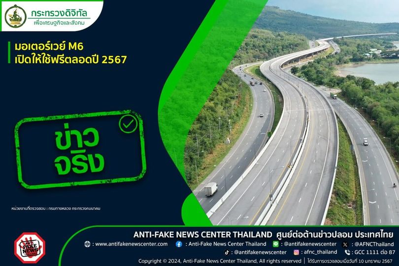 ตามที่มีข่าวสารประเด็นเรื่องมอเตอร์เวย์ M6 เปิดให้ใช้ฟรีตลอดปี 2567 ทางศูนย์ต่อต้านข่าวปลอมได้ดำเนินการตรวจสอบข้อเท็จจริงโดยกรมทางหลวง กระทรวงคมนาคม พบว่าประเด็นดังกล่าวนั้น เป็นข้อมูลจริง ?