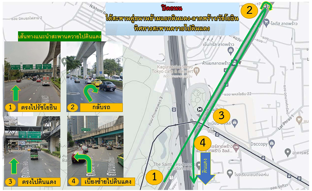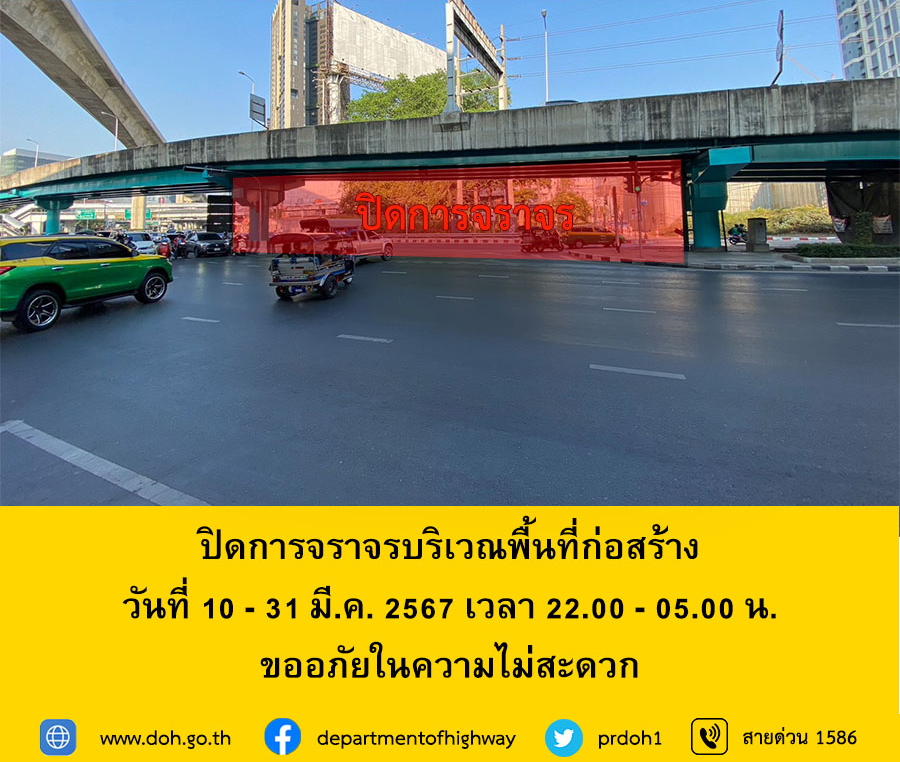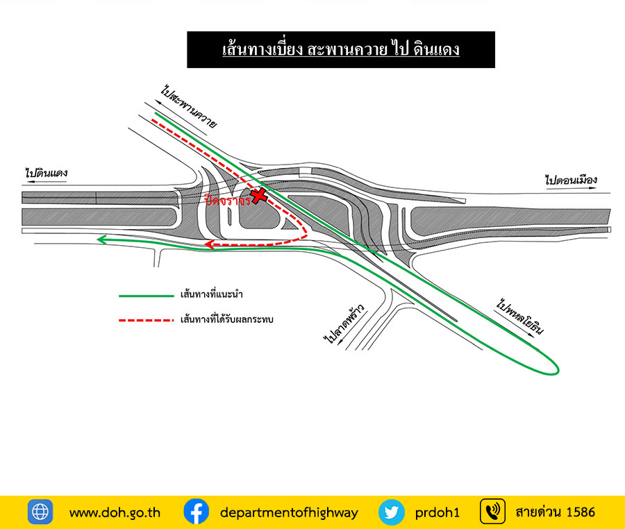 โดยจะทำการปิดถนนใต้สะพานข้ามเเยกดินแดง - ลาดพร้าว/พหลโยธิน (ทิศทางสะพานควายมุ่งหน้าดินแดง) โปรดสังเกตป้ายเตือนและปฏิบัติตามป้ายเเนะนำ เพื่อความปลอดภัยของผู้ใช้รถใช้ถนน ในระหว่างดำเนินการอาจทำให้ท่านไม่ได้รับความสะดวก กรมทางหลวงต้องขออภัย ณ โอกาสนี้ และขอให้ประชาชนใช้เส้นทางอย่างระมัดระวัง เเละโปรดหลีกเลี่ยงการใช้เส้นทางบริเวณดังกล่าว เพื่อป้องกันการจราจรติดขัด ทั้งนี้ สามารถสอบถามรายละเอียดเพิ่มเติมหรือแจ้งเหตุต่างๆ ระหว่างดำเนินการได้ที่สายด่วนกรมทางหลวง 1586 (โทรฟรีทุกเครือข่ายตลอด 24 ชั่วโมง)