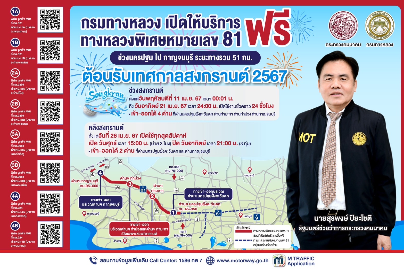 นายสุรพงษ์ ปิยะโชติ รัฐมนตรีช่วยว่าการกระทรวงคมนาคม เปิดเผยว่า รัฐมนตรีว่าการกระทรวงคมนาคม นายสุริยะ จึงรุ่งเรืองกิจ มีความห่วงใยประชาชนผู้ใช้ทางในช่วงเทศกาลสงกรานต์2567 ที่จะถึงนี้ จึงได้มอบหมายให้ทุกหน่วยงานเตรียมความพร้อมมาตรการอำนวยความสะดวกและความปลอดภัยในทุกมิติ เพื่อให้พี่น้องประชาชนเดินทางกลับบ้านและเดินทางท่องเที่ยวอย่างมีความสุข ตามนโยบาย “คมนาคมเพื่อความอุดมสุขของประชาชน” โดยได้สั่งการให้กรมทางหลวง เร่งดำเนินการ โดยเฉพาะอย่างยิ่งทางหลวงพิเศษระหว่างเมืองหมายเลข 81 (M81) สายบางใหญ่ - กาญจนบุรี เพื่อเติมเต็มโครงข่ายทางหลวงพิเศษระหว่างเมือง เพิ่มความสะดวก รวดเร็ว และปลอดภัยให้กับประชาชนในการเดินทางและขนส่งสินค้า จากกรุงเทพฯ และปริมณฑล ไปสู่เขตพัฒนาเศรษฐกิจพิเศษจังหวัดกาญจนบุรี และภาคตะวันตกของประเทศ ส่งเสริม การค้า การลงทุน การท่องเที่ยว และเพิ่มขีดความสามารถทางการแข่งขันของไทยบนเวทีโลก ปัจจุบัน ทล. อยู่ระหว่างดำเนินการก่อสร้าง M81 โดยมีความก้าวหน้า ณ เดือนกุมภาพันธ์ 2567 งานโยธา ร้อยละ 97.51 ส่วนงานติดตั้งระบบ เช่น ระบบจัดเก็บค่าผ่านทาง ระบบบริหารจัดการและควบคุมการจราจร ร้อยละ 39.08 เนื่องจากการก่อสร้างงานโยธามีความคืบหน้าจนเกือบสมบูรณ์แล้ว ทล. จึงมีแผนเปิดให้บริการ M81 เป็นการชั่วคราว โดยในช่วงสงกรานต์จะเปิดให้ประชาชนสามารถเข้าออกได้ที่ด่านนครปฐมตะวันตก ด่านท่ามะกา ด่านท่าม่วง และด่านกาญจนบุรี ตลอด 24 ชั่วโมง ตั้งแต่วันพฤหัสบดีที่ 11 เมษายน 2567 เวลา 00.01 น. ถึงวันอาทิตย์ที่ 21 เมษายน 2567 เวลา 24.00 น. โดยไม่เก็บค่าธรรมเนียมผ่านทาง เพื่ออำนวยความสะดวกให้แก่ประชาชน โดยเฉพาะอย่างยิ่งพี่น้องประชาชนชาวกาญจนบุรีและจังหวัดใกล้เคียงที่จะสามารถเดินทางในช่วงเทศกาลสงกรานต์ได้อย่างสะดวกรวดเร็วมากยิ่งขึ้น และเป็นการส่งเสริมการท่องเที่ยวจังหวัดกาญจนบุรี และภาคตะวันตกได้เป็นอย่างดี นอกจากนี้ ทล. ยังมีแผนเปิดให้บริการ M81 สายบางใหญ่- กาญจนบุรี ในช่วงวันหยุดสุดสัปดาห์ เพื่อกระตุ้นให้ประชาชนมีการเดินทางมากขึ้น โดยเปิดให้ผู้ใช้ทางสามารถเข้าออกได้ที่ด่านนครปฐมตะวันตกและด่านกาญจนบุรี ในทุกวันศุกร์ เวลา 15.00 น. และปิดด่านวันอาทิตย์ เวลา 21.00 น. เริ่มเปิดให้บริการตั้งแต่วันที่ 26 เมษายน 2567 นี้