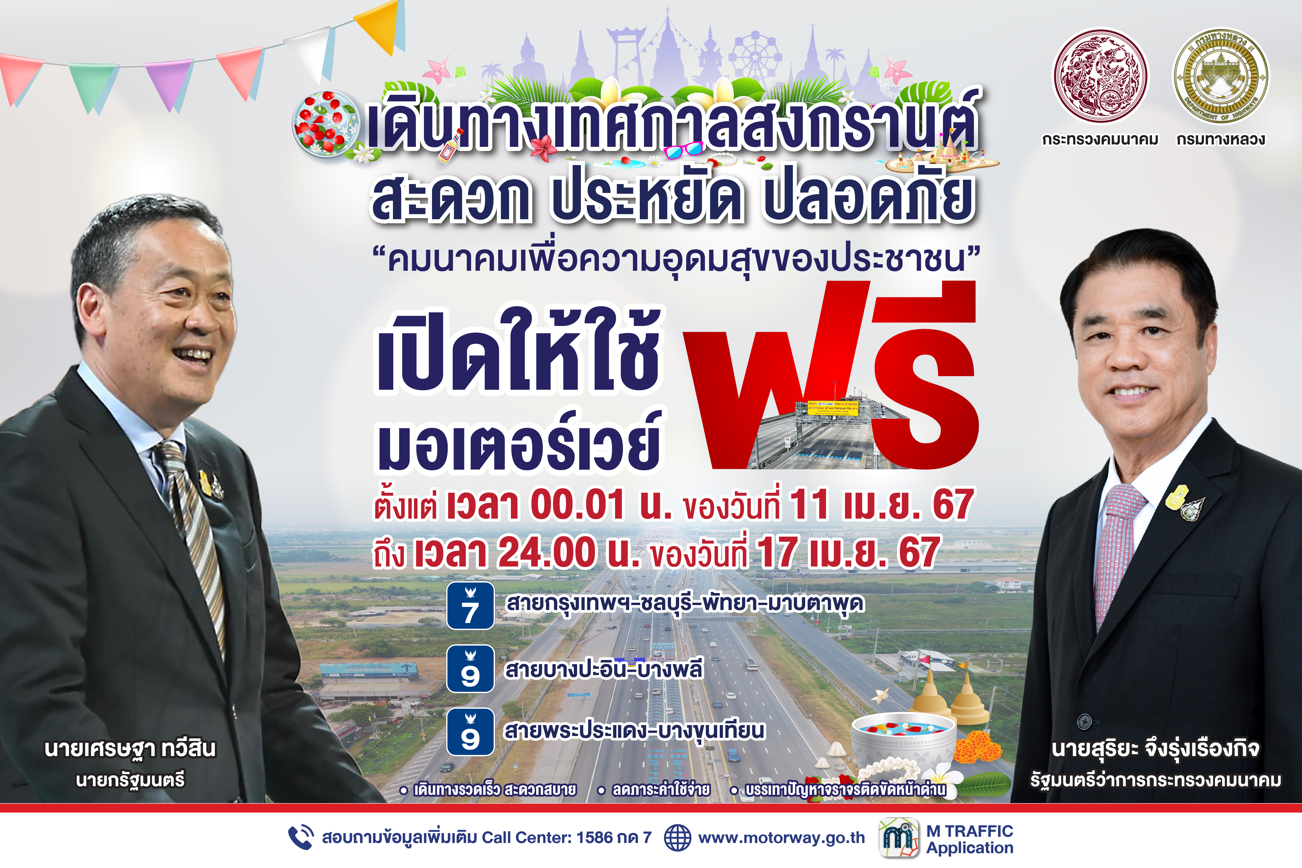 “สงกรานต์สุขใจ” เปิดวิ่งฟรีมอเตอร์เวย์ 7 วันเต็ม ทั้ง M7, M9 ส่วน M6 และM81 เปิดวิ่งชั่วคราวเหมือนเดิม