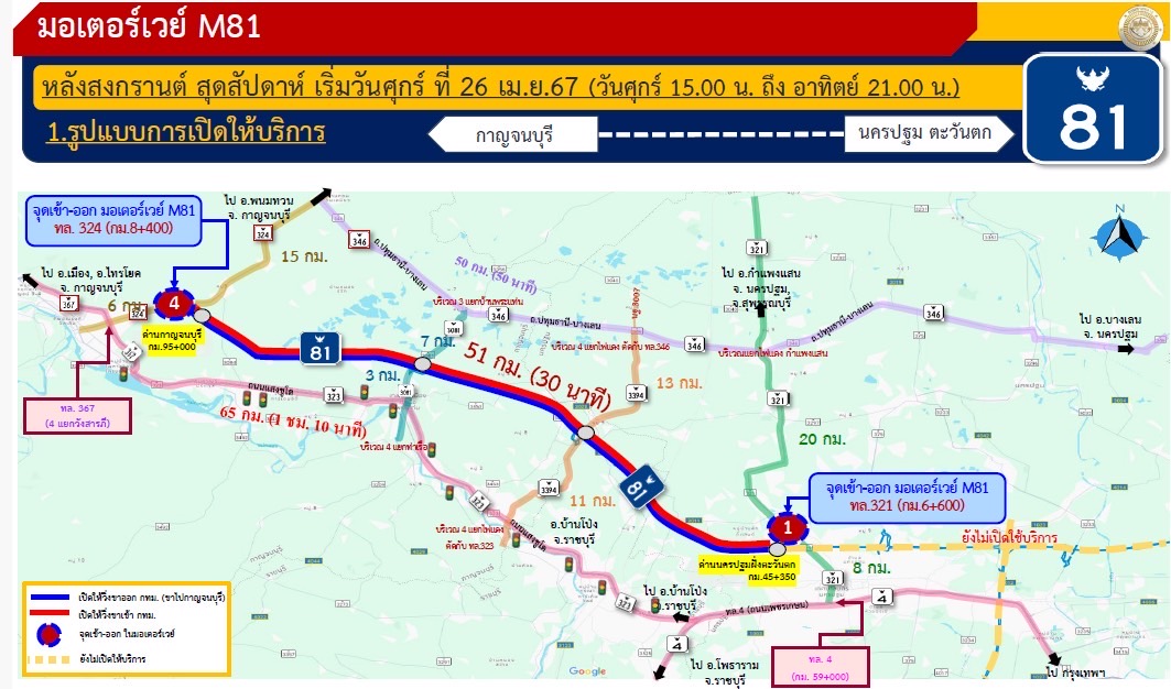 นายสราวุธ ทรงศิวิไล อธิบดีกรมทางหลวง เปิดเผยว่า ตามที่กรมทางหลวงได้เปิดให้วิ่งฟรีชั่วคราวทางหลวงพิเศษหมายเลข 81 (มอเตอร์เวย์) สายบางใหญ่ – กาญจนบุรี ช่วงนครปฐมตะวันตก – กาญจนบุรี ระยะทาง 51 กิโลเมตร ในช่วงเทศกาลปีใหม่และช่วงเทศกาลสงกรานต์ที่ผ่านมานั้น ทั้งนี้ เพื่อเป็นการอำนวยความสะดวกและปลอดภัยให้กับประชาชนที่จะเดินทางไปยังภาคตะวันตกในช่วงเวลาปกติ กรมทางหลวงจึงจะทำการเปิดวิ่งฟรีชั่วคราวบนเส้นทางดังกล่าวทุกสุดสัปดาห์เฉพาะวันศุกร์ ตั้งแต่เวลา 15.00 น. ถึง วันอาทิตย์ เวลา 21.00 น. โดยสามารถเข้า-ออก ได้เฉพาะบริเวณด่านฯ นครปฐมตะวันตกและด่านฯ กาญจนบุรี เท่านั้น เริ่มตั้งแต่วันศุกร์ที่ 26 เมษายน 2567 เป็นต้นไป