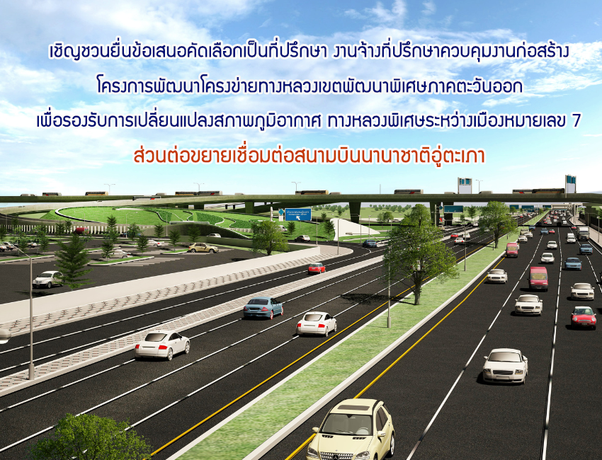 is seeking consulting firms to submit an expression of interest (EOI) to participate as a Construction Supervision Consultant (CSC) for the project titled Climate-Resilient Connectivity for the Eastern Economic Corridor Project: The Intercity Motorway No. 7 (Extension to Link with U-Tapao International Airport) by using the Quality and Cost Based Selection (QCBS) method. The project is financed by loans from the Asian Development Bank (ADB) and the Thai government budget.