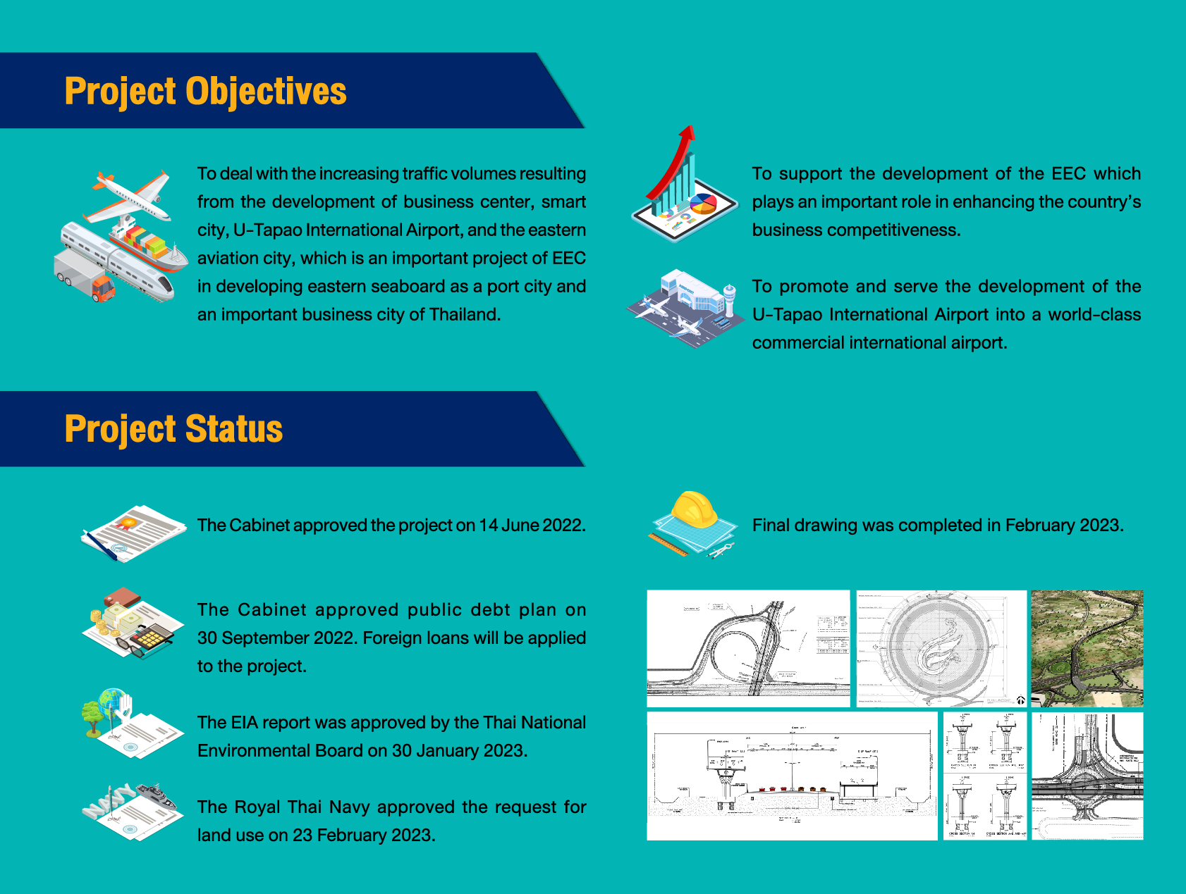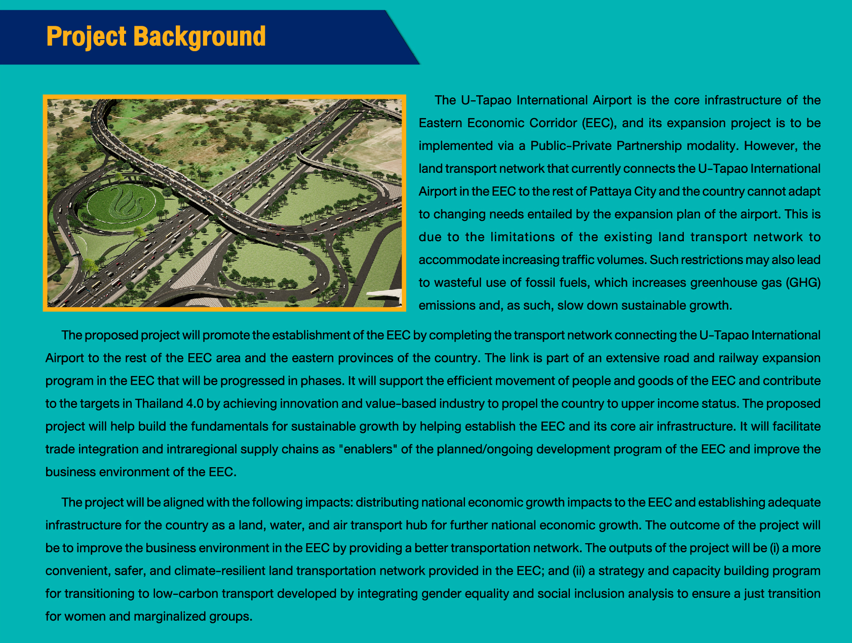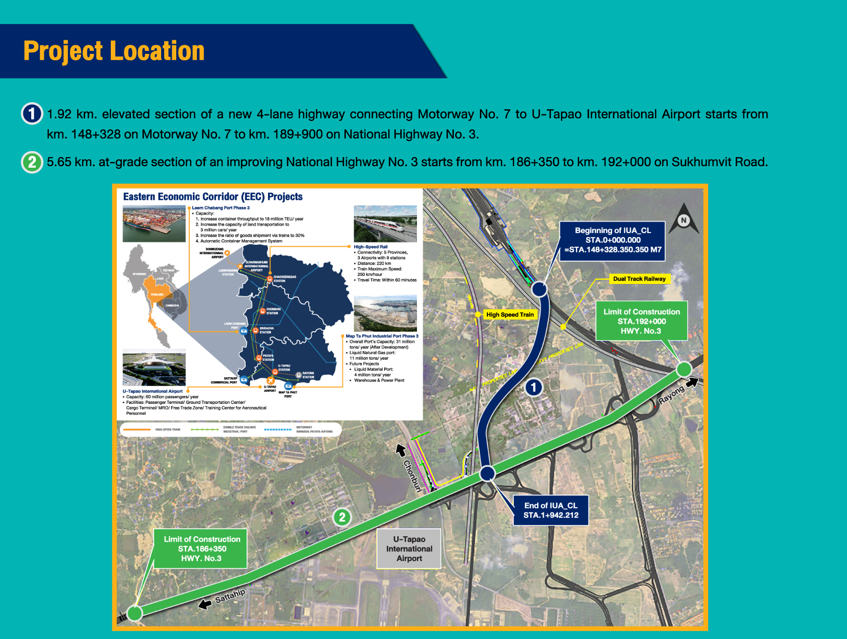 ทางหลวงเขตพัฒนาพิเศษภาคตะวันออก เพื่อรองรับการเปลี่ยนแปลงสภาพภูมิอากาศ ทางหลวงพิเศษระหว่างเมืองหมายเลข 7 ส่วนต่อขยายเชื่อมต่อสนามบินนานาชาติอู่ตะเภา โดยวิธี Quality and Cost Based Selection (QCBS) โดยโครงการดังกล่าวใช้เงินกู้จากธนาคารพัฒนาเอเชีย (Asian Development Bank, ADB) และเงินงบประมาณสมทบ