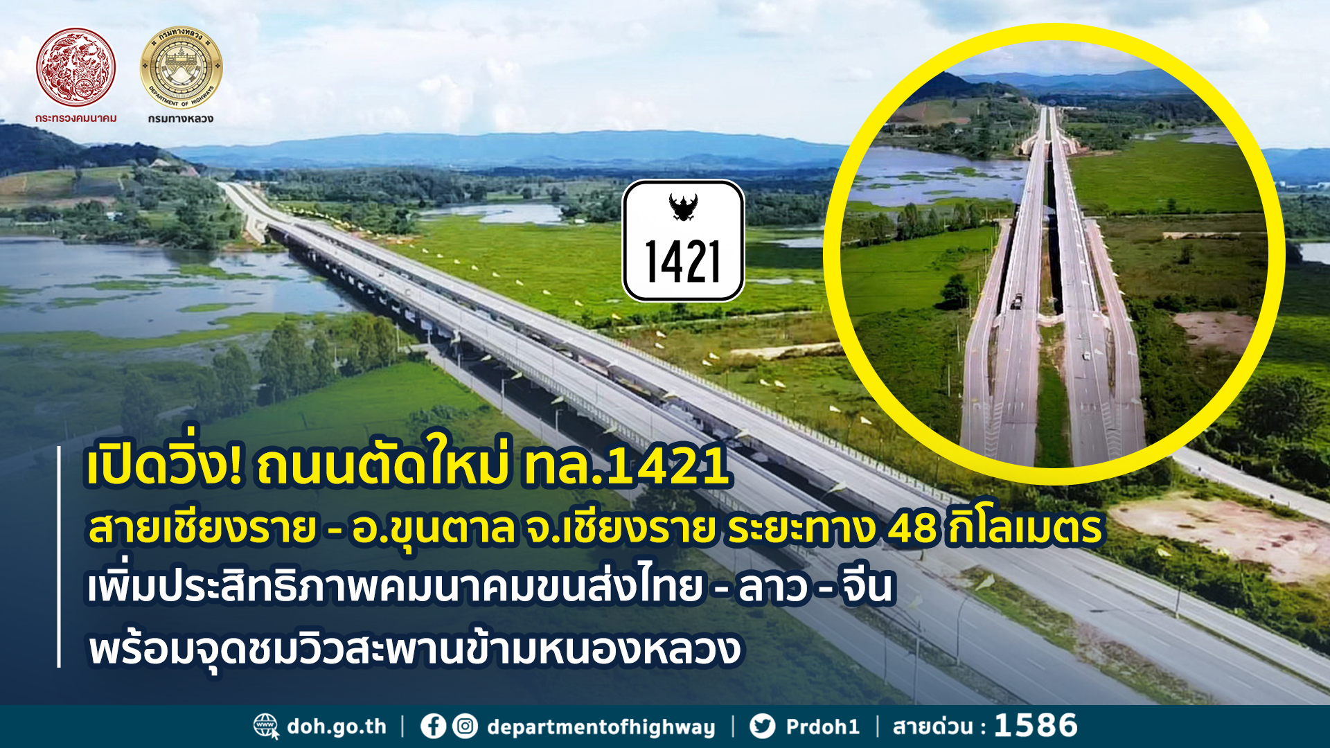 นายสราวุธ ทรงศิวิไล อธิบดีกรมทางหลวง เปิดเผยถึง การดำเนินการพัฒนาโครงข่ายทางหลวงแนวใหม่ในพื้นที่จังหวัดเชียงราย เพื่อรองรับการคมนาคมและการขนส่งระหว่างประเทศไทยกับประเทศเพื่อนบ้าน ซึ่งขณะนี้กรมทางหลวงได้ดำเนินการโครงการก่อสร้างทางหลวงหมายเลข 1421 สายเชียงราย - อ.ขุนตาล แล้วเสร็จตลอดสาย ระยะทาง 48.19 กิโลเมตร เพื่อยกระดับคุณภาพชีวิตประชาชนให้สามารถเดินทางได้อย่างสะดวก รวดเร็ว และปลอดภัย