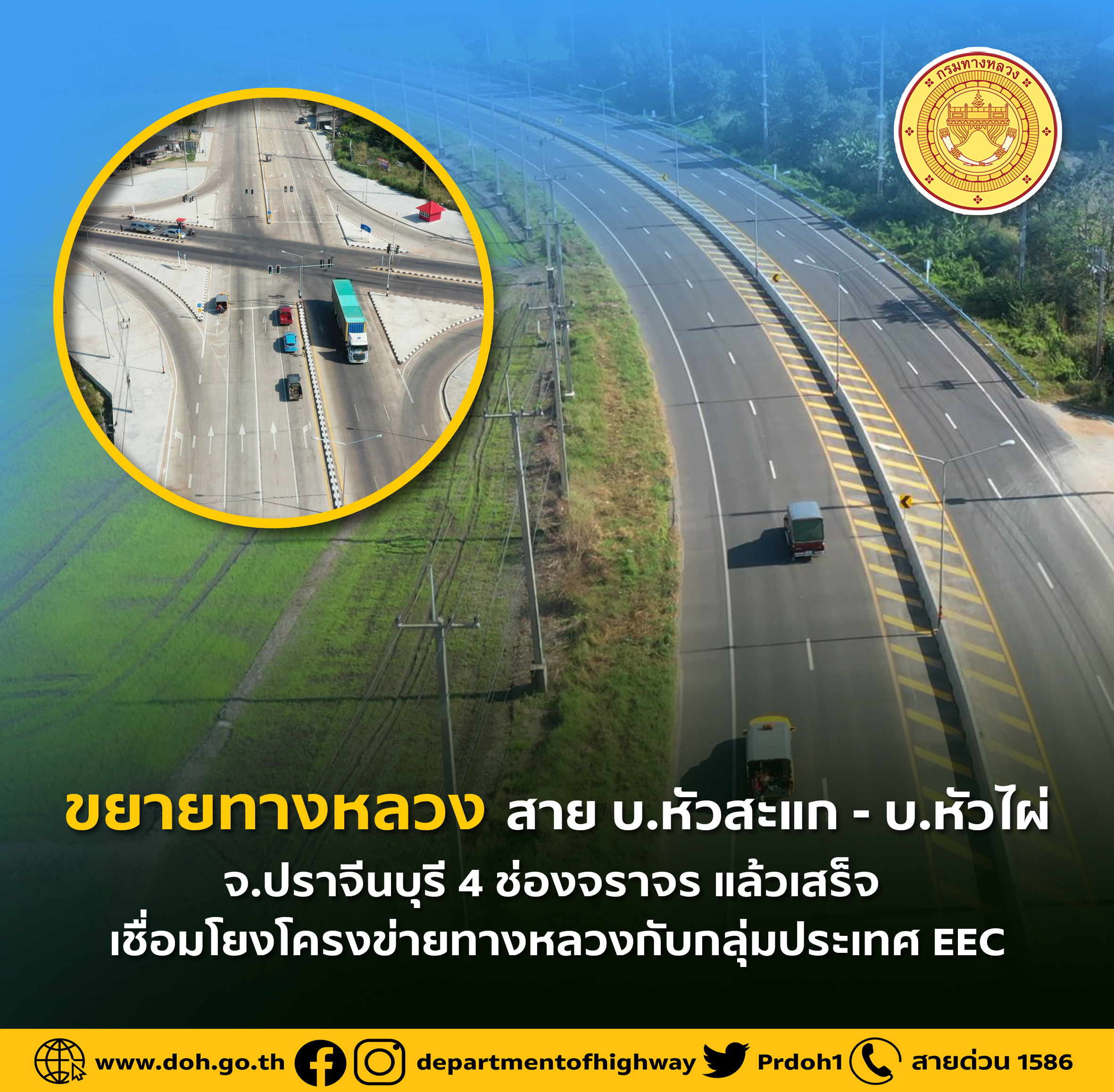 ปัจจุบันโครงการฯ ได้ดำเนินการก่อสร้างแล้วเสร็จ ช่วยเพิ่มประสิทธิภาพในการรองรับปริมาณการจราจรได้อย่างมีประสิทธิภาพ และยกระดับคุณภาพชีวิตประชาชนให้ได้รับความสะดวก รวดเร็ว ปลอดภัย สนับสนุนระบบการขนส่ง โลจิสติกส์ระหว่างภาคตะวันออกกับภาคตะวันออกเฉียงเหนือ รวมทั้งรองรับการเชื่อมโยงโครงข่ายทางหลวงกับกลุ่มประเทศ EEC ช่วยส่งเสริมทางด้านการค้าการลงทุน การท่องเที่ยว เพิ่มศักยภาพในการแข่งขันของประเทศนำไปสู่การพัฒนาที่ยั่งยืนของประเทศตามนโยบายของรัฐบาล