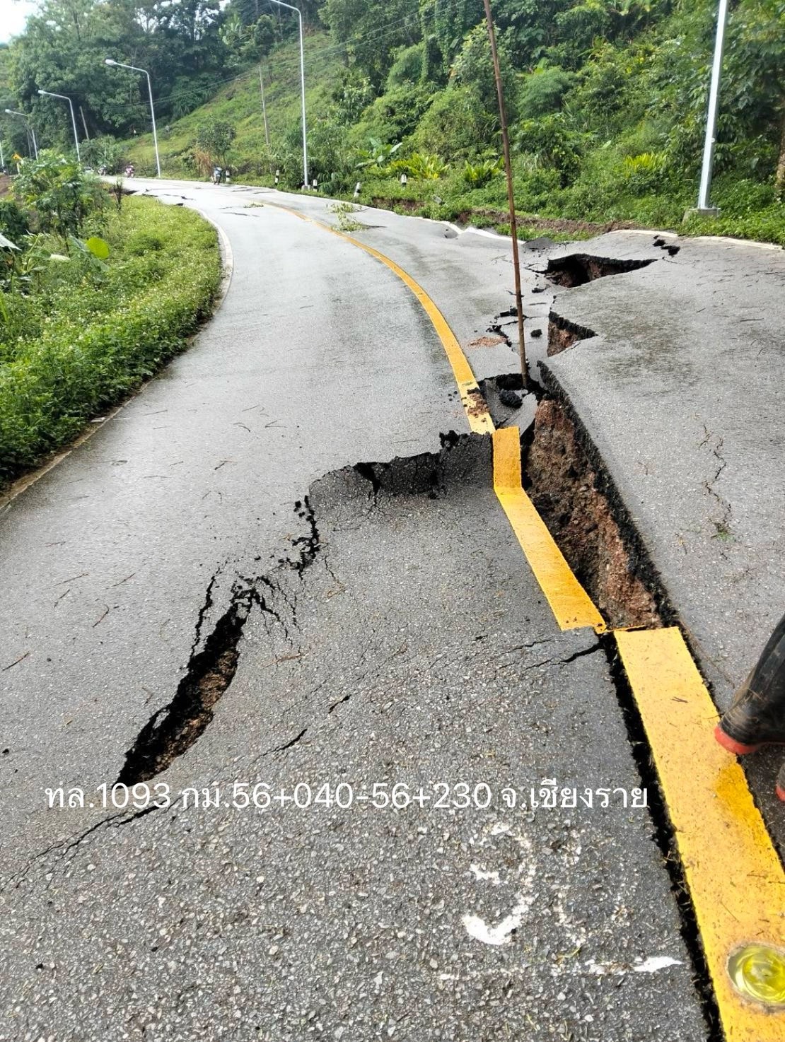 3. ทางหลวงหมายเลข 1093 ขุนห้วยไคร้ – ผาตั้ง ช่วง กม.ที่ 56+040 – 56+230 ในพื้นที่อำเภอเวียงแก่น จังหวัดเชียงราย เกิดเหตุดินสไลด์ทำให้คันทางทรุดตัว ไม่มีเส้นทางเลี่ยงทดแทน