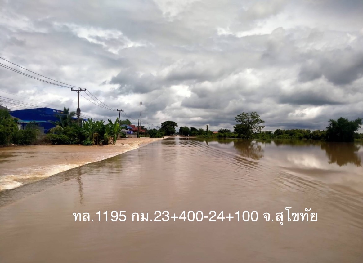 1. ทางหลวงหมายเลข 1195 เตว็ดใน – วังไม้ขอน ช่วง กม.ที่ 12+725 – 13+550 ในพื้นที่อำเภอศรีสำโรง จังหวัดสุโขทัย ระดับน้ำสูง 45 ซม. แนะนำใช้ทางเลี่ยงแยกเกาะวงษ์เกียรติ์ และทางเลี่ยงแยก อบต.วังทอง