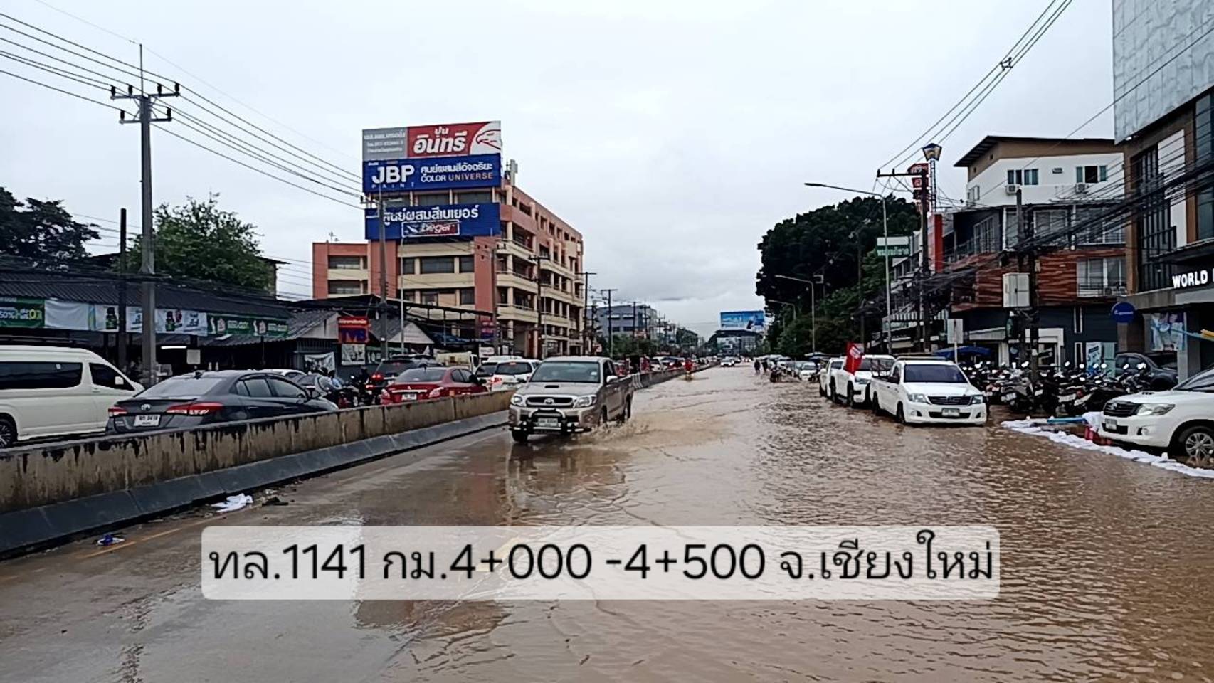 4. ทางหลวงหมายเลข 118 อ.เวียงป่าเป่า สายดอยนางแก้ว - แม่สรวย กม.ที่ 92+750 – 93+200 ระดับน้ำ 50 ซม. การจราจรผ่านไม่ได้ ไม่มีเส้นทางเลี่ยง