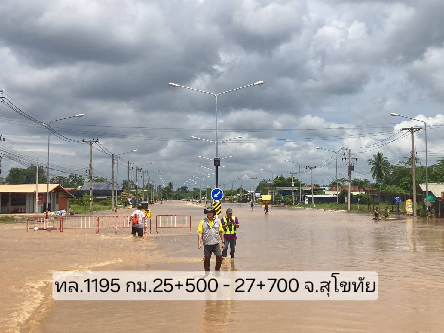 3. ทางหลวงหมายเลข 1195 อ.สวรรคโลก สายเตว็ดใน – วังไม้ขอน กม.ที่ 25+500 – 27+700 ระดับน้ำ 35 ซม.การจราจรผ่านไม่ได้ ไม่มีเส้นทางเลี่ยง