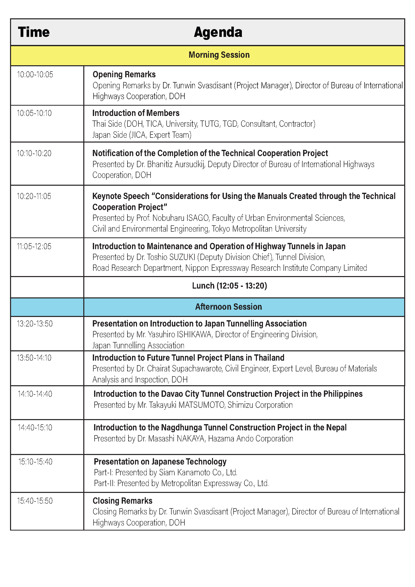 ในงานสัมมนาครั้งนี้มีการบรรยายพิเศษที่เกี่ยวกับการดำเนินงานโครงการอุโมงค์และการบรรยายในหัวข้อปาฐกถาพิเศษ เรื่อง “Considerations for Using the Manuals Created through the Technical Cooperation Project” บรรยายโดย Prof. Nobuharu ISAGO, Tokyo Metropolitan University รวมทั้งยังมีการบรรยายจาก Nippon Expressway Research Institute Company Limited และ Japan Tunnelling Association (JTA) อีกด้วย รวมถึงการนำเสนอเทคโนโลยีในประเทศญี่ปุ่นโดยบริษัทเอกชนญี่ปุ่น ในวันศุกร์ที่ 20 ธันวาคม 2567 เวลา 10:00-16:30 น. ณ ห้องสัมมนาเทิดศักดิ์ เศรษฐมานพ ชั้น 3 กองฝึกอบรม กรมทางหลวง และการสัมมนาผ่านสื่อออนไลน์ แอพพลิเคชั่น ZOOM