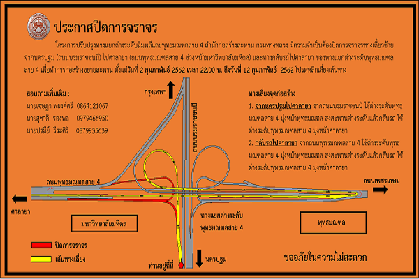 กรมทางหลวง โดยแขวงทางหลวงสมุทรสาคร จะดำเนินการก่อสร้างขยายสะพานในโครงการก่อสร้าง ปรับปรุงทางแยกต่างระดับพุทธมณฑลสาย 4 ตั้งแต่วันที่ 2 กุมภาพันธ์ 2562 เวลา 22.00 น. ถึงวันที่ 12 กุมภาพันธ์ 2562 เวลา 06.00 น. กรมทางหลวงจึงมีความจำเป็นต้องปิดการจราจรทางเลี้ยวซ้ายจากนครปฐม (ถนนบรมราชชนนี) ไปศาลายา (ถนนพุทธมณฑลสาย 4 ช่วงหน้ามหาวิทยาลัยมหิดล ศาลายา) ผู้ใช้เส้นทางหลีกเลี่ยงจุดก่อสร้างดังกล่าว โดยใช้เส้นทาง ดังนี้