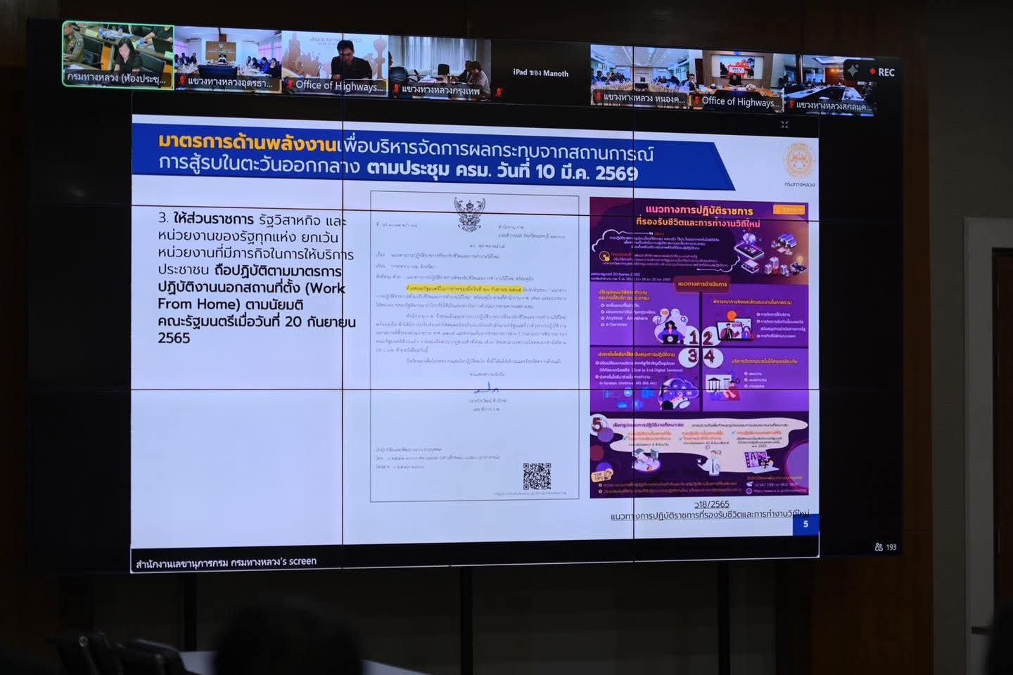 ที่ประชุมได้หารือการเตรียมความพร้อมมาตรการด้านพลังงานเพื่อบริหารจัดการผลกระทบจากสถานการณ์ความขัดแย้งในตะวันออกกลาง ให้เป็นไปตามมติคณะรัฐมนตรี เมื่อวันที่ 10 มีนาคม 2569 โดยมุ่งบริหารจัดการการใช้พลังงานอย่างเหมาะสม ควบคู่กับการรักษาประสิทธิภาพการปฏิบัติราชการของหน่วยงานให้ดำเนินไปอย่างต่อเนื่อง ภายใต้แนวทางการปฏิบัติราชการที่รองรับชีวิตและการทำงานวิถีใหม่ ทั้งนี้ กรมทางหลวงจะเร่งพิจารณาแนวทางปฏิบัติที่ชัดเจนและเหมาะสม เพื่อให้หน่วยงานสามารถดำเนินภารกิจได้อย่างมีประสิทธิภาพ