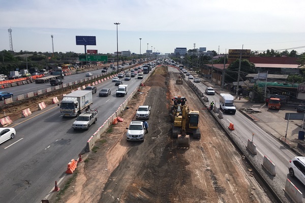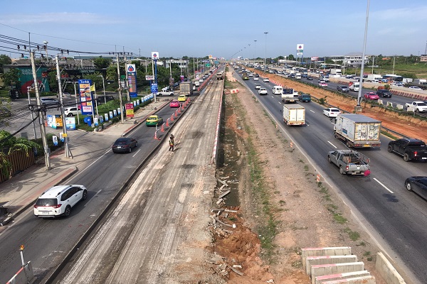 ลักษณะถนนเดิมประกอบด้วย ทางขนานจำนวน 2 ช่องจราจร ทางหลักจำนวน 3 ช่องจราจร ขาเข้า กทม. และขาออก กทม. ข้างละ 5 ช่องจราจร รวม 10 ช่องจราจร ลักษณะการก่อสร้างของโครงการฯ ทั้ง 3 ตอนทางขนาน (Frontage Road) จะก่อสร้างขยายคันทางจากเดิม 2 ช่องจราจรเป็น 3 ช่องจราจร โดยระดับก่อสร้างของทางขนานใหม่จะสูงขึ้นจากระดับของทางขนานเดิมโดยเฉลี่ยประมาณ 0.40 เมตร ส่วนทางหลัก (Main Road) จะก่อสร้างขยายคันทางจากเดิม 3 ช่องจราจรเป็น 4 ช่องจราจร โดยระดับก่อสร้างของทางหลักใหม่จะสูงขึ้นจากระดับของทางหลักเดิมโดยเฉลี่ยประมาณ 0.50 – 0.70 เมตร รวมช่องจราจรทั้งสิ้น 14 ช่องจราจร (ขาเข้า กทม. และขาออก กทม.ข้างละ 7 ช่องจราจร) พร้อมก่อสร้างสะพานกลับรถ 2 แห่ง ที่ กม. 12+000.000 (แสมดำ) และ กม. 16+000.000 (ก่อนถึงซอยพันท้ายนรสิงห์)