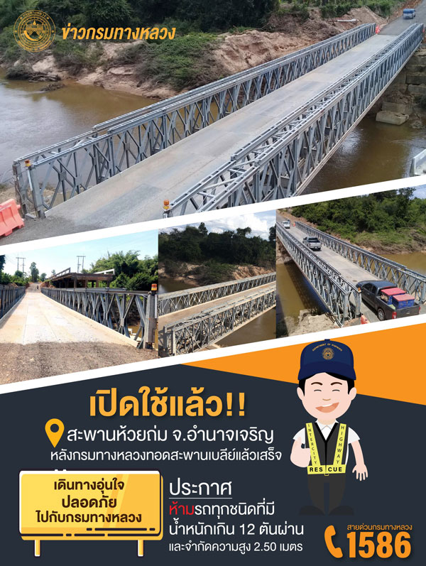 นายสราวุธ ทรงศิวิไล อธิบดีกรมทางหลวง เปิดเผยว่า ตามที่ได้เกิดสถานการณ์น้ำท่วมจากพายุโซนร้อนโพดุลและมีรถบรรทุกน้ำหนักเกินวิ่งข้ามสะพานห้วยถ่มจนทำให้สะพานเบลี่ย์พังทลายบนทางหลวงหมายเลข2034 ตอน นาสีนวน – มุ่งเขียว ช่วงกม.ที่ 59+148 อ.ชานุมาน จ.อำนาจเจริญ และประชาชนผู้ใช้ทางไม่สามารถสัญจรผ่านได้นั้น ปัจจุบันกรมทางหลวงโดยศูนย์สร้างและบูรณะสะพานที่ 2 (ขอนแก่น) ซึ่งมีความพร้อมทั้งเจ้าหน้าที่ ยานพาหนะ เครื่องจักร และเครื่องมือ ได้ทำการทอดสะพานเบลี่ย์ซึ่งเป็นสะพานเหล็กชั่วคราวแล้วเสร็จใช้เป็นทางเบี่ยงแทนสะพานเดิมที่พังทลายใช้งานไม่ได้ โดยสามารถเปิดการจราจรได้แล้วตามปกติตั้งแต่วันที่ 14 ต.ค. 62 เพื่อบรรเทาความเดือดร้อนของประชาชนให้สามารถสัญจรไปมาได้