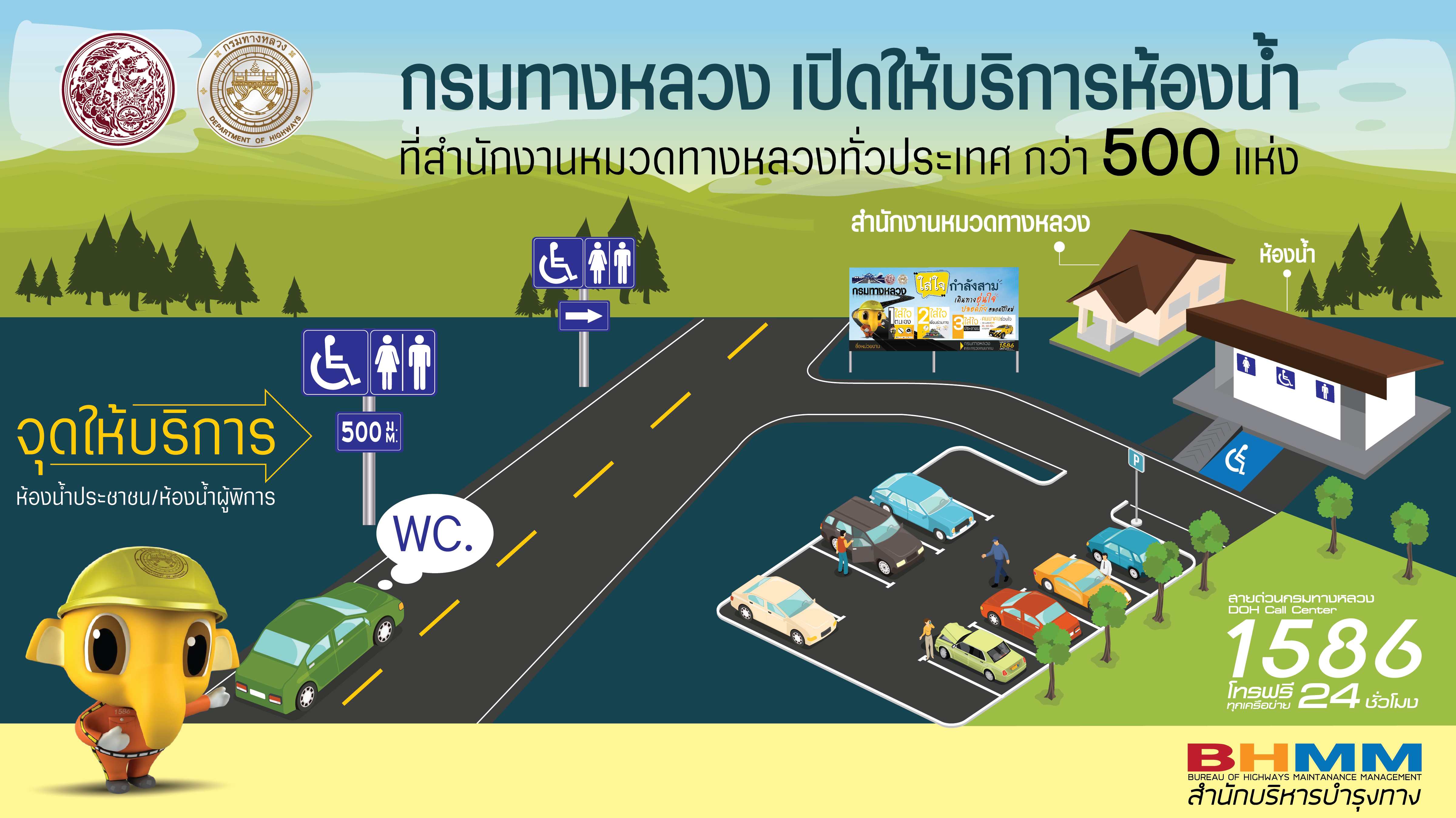นายสราวุธ ทรงศิวิไล อธิบดีกรมทางหลวง เปิดเผยว่า กรมทางหลวง ได้จัดเตรียมห้องน้ำ พร้อมให้บริการกว่า 500 แห่ง ที่สำนักงานหมวดทางหลวง ทั่วประเทศ เพื่อให้บริการประชาชน และนักท่องเที่ยว ในการเดินทางช่วงเทศกาลปีใหม่ 2563 ซึ่งมีทั้งความสะดวก สะอาด และ ปลอดภัย รวมทั้ง ยังสามารถจอดรถแวะพักผ่อน สอบถามเส้นทาง กับเจ้าหน้าที่ ก่อนที่จะเดินทางต่อ ซึ่งเป็นการลดความแออัดการจราจรบริเวณปั้มน้ำมันได้อีกทางหนึ่ง