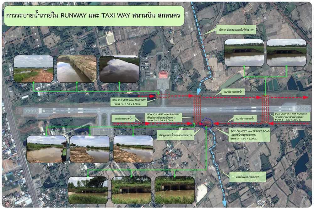 กรมทางหลวง โดยฝ่ายประชาสัมพันธ์ เปิดเผยว่าตามที่ในหลายพื้นที่ประสบปัญหาน้ำท่วม โดยเฉพาะพื้นที่ภาคตะวันออกเฉียงเหนือ รวมถึงการรับมือสถานการณ์น้ำล้นเขื่อนในพื้นที่จังหวัดเพชรบุรีนั้น ในส่วนของกรมทางหลวงได้สั่งการให้เจ้าหน้าที่เตรียมพร้อม ตลอด 24 ชั่วโมง เพื่อรับมือสถานการณ์น้ำท่วมฉับพลัน สำหรับสถานการณ์ปัจจุบัน (7 สิงหาคม 2561 ) เวลา 14.00 เส้นทางในความรับผิดชอบของกรมทางหลวงทุกเส้นทางสามารถเดินทางได้ตามปกติ ทั้งนี้ กรมทางหลวง โดยสำนักงานทางหลวงที่ 3 (สกลนคร) ได้บูรณาการร่วมกับองค์การบริหารส่วนจังหวัด(อบจ.) กรมป้องกันและบรรเทาสาธารณภัย(ปภ.) และผู้ว่าราชการจังหวัดสกลนคร ในการเตรียมความพร้อมในการแก้ไขปัญหาเร่งด่วนป้องกันน้ำท่วมรันเวย์สนามบินสกลนครและบริเวณรอบพื้นที่สนามบิน เช่น ขุดลอกคูน้ำจุดที่วิกฤต ขุดลอกคูระบายน้ำรอบสนามบินทั้งหมด เสริมคันกั้นรอบสนามบินที่มีอยู่แล้วให้สูงขึ้น และเพิ่มท่อเหลี่ยมบริเวณหัวและท้ายสนามบิน เพื่อเสริมประสิทธิภาพการระบายน้ำและป้องกันน้ำท่วมสนามบินสกลนครระยะยาว อีกทั้ง เป็นการอำนวยความสะดวกให้ผู้ใช้ทางในการเดินทางยังสนามบินสกลนครอีกด้วย