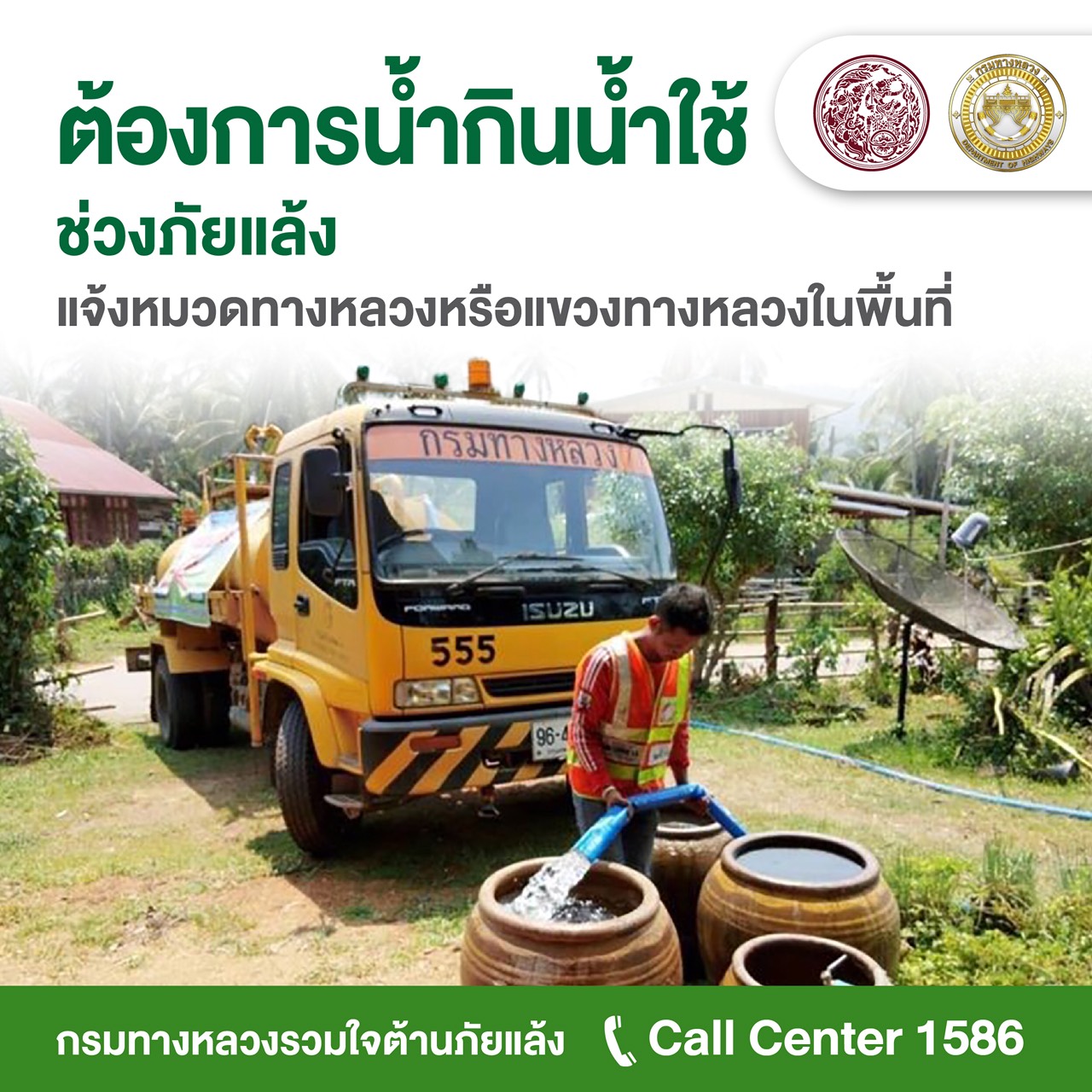 รมว.คมนาคม มอบนโยบายกรมทางหลวงลุยแจกจ่ายน้ำกิน-น้ำใช้แก่ประชาชนทั่วประเทศตลอด 24 ชม.บรรเทาปัญหาขาดแคลนน้ำช่วงภัยแล้ง พร้อมจ้างงานเกษตรกรท้องถิ่นชดเชยสูญเสียรายได้จากการเพาะปลูก และกำชับโครงการก่อสร้างภายใต้กำกับใส่ใจประหยัดน้ำ หวังลดปัญหาอีกทาง