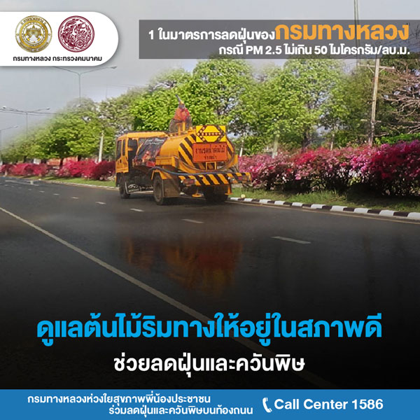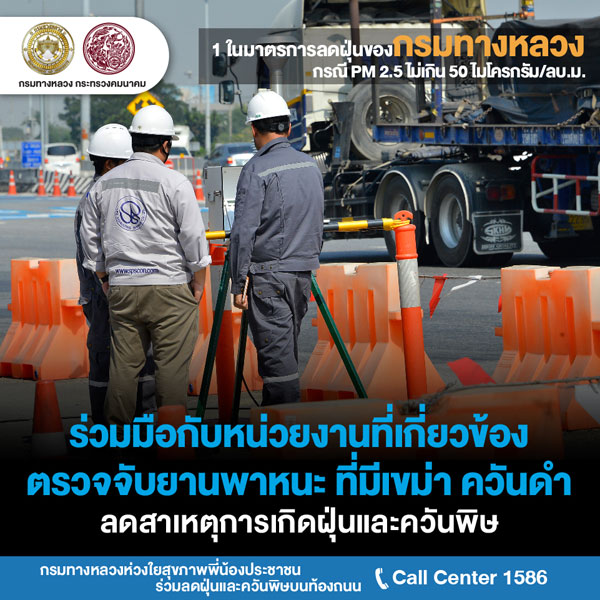 นายสราวุธ ทรงศิวิไล อธิบดีกรมทางหลวง (ทล.) เปิดเผยว่า สั่งการให้สำนักงานทางหลวงแขวงทางหลวง และหมวดทางหลวงทั่วประเทศ ดำเนินการตามแผนปฏิบัติการขับเคลื่อนวาระแห่งชาติของรัฐบาลในการแก้ไขปัญหามลพิษด้านฝุ่นละอองขนาดเล็ก หรือ PM 2.5 ด้วยการกำหนดมาตรการป้องกันแก้ไขปัญหาฝุ่นละอองใน 2 กรณี คือ กรณีที่ระดับปริมาณฝุ่น PM 2.5 มีค่าไม่เกิน 50 ไมโครกรัมต่อลูกบาศก์เมตร และกรณีเกิดสถานการณ์วิกฤตที่ระดับปริมาณฝุ่น PM 2.5 มีค่าเกิน 50 ไมโครกรัมต่อลูกบาศก์เมตรขึ้นไป กรณีที่ระดับปริมาณฝุ่น PM 2.5 มีค่าไม่เกิน 50 ไมโครกรัมต่อลูกบาศก์เมตร กรมทางหลวง จะดำเนินการมาตการ ดังนี้ ด้านงานก่อสร้างและบำรุงทาง มีการจำกัดพื้นที่หน้างานที่ก่อให้เกิดฝุ่นละอองให้น้อยที่สุดเท่าที่จำเป็น การเข้มงวดมาตรการป้องกันและลดฝุ่นละออง เช่น การปิดคลุมวัสดุก่อสร้างในการเก็บกองและ ขนย้าย การตรวจสอบสภาพเครื่องจักรก่อสร้างให้อยู่ในสภาพดี ห้ามใช้เครื่องจักรที่ก่อให้เกิดเขม่าควันดำ และการงดใช้น้ำมันเครื่องที่ใช้แล้วกับเครื่องจักรอุปกรณ์ เป็นต้น ส่วนขยะที่เกิดจากการก่อสร้างจะมีการจัดการอย่างเหมาะสม ห้ามเผาขยะโดยเด็ดขาด โดยพิจารณาวิธีการก่อสร้างที่ใช้การเผาไหม้เชื้อเพลิงน้อย เช่น warm mix asphalt การทำความสะอาด เศษฝุ่น เศษวัสดุที่สะสมบริเวณขอบทางและเกาะกลางอย่างสม่ำเสมอ รวมทั้งบูรณาการการทำงานร่วมกับจังหวัดทั่วประเทศในการลดการเกิดฝุ่นควัน และการอำนวยความสะดวกต่อการจราจรบนถนนบริเวณพื้นที่ก่อสร้าง เพื่อไม่ให้เกิดการจราจรติดขัดจากการก่อสร้างและบำรุงทาง ด้านงานการให้บริการผู้ใช้ทางและบริหารจัดการจราจรบนสายทาง จะประสานความร่วมมือระหว่างตำรวจทางหลวงและหน่วยงานที่เกี่ยวข้อง เช่น กรมควบคุมมลพิษในการตรวจจับรถยนต์ที่มีเขม่าควันดำ และเข้มงวดไม่ให้มีการจอดรถในพื้นที่ผิวถนนที่มีการจราจรแออัด จัดการจราจรให้ลื่นไหลลด การติดขัด รวมทั้งการบำรุงรักษาต้นไม้ริมทางหลวงให้อยู่ในสภาพดี เพื่อช่วยจับฝุ่นละอองจากถนน และเฝ้าระวังการเกิดปัญหาไฟป่าโดยการจัดชุดเคลื่อนที่เร็วพร้อมอุปกรณ์ในการป้องกันและควบคุม ด้านงานสำนักงาน ด้วยการลดการเดินทางของบุคลากร พิจารณาใช้เทคโนโลยีในการทำงานที่ช่วยลดการเดินทาง ลดการใช้ยานพาหนะส่วนตัว โดยเปลี่ยนการขนส่งสาธารณะโดยเฉพาะรถไฟฟ้า ตลอดจน การใช้รถยนต์ร่วมกัน (Carpool) สำหรับการเดินทางเส้นทางเดียวกัน นอกจากนั้นยังมีการจัดการขยะอย่างเหมาะสมโดยใช้วิธีการห้ามเผาโดยเด็ดขาด และรณรงค์ให้บุคลากรประหยัดพลังงานในสำ