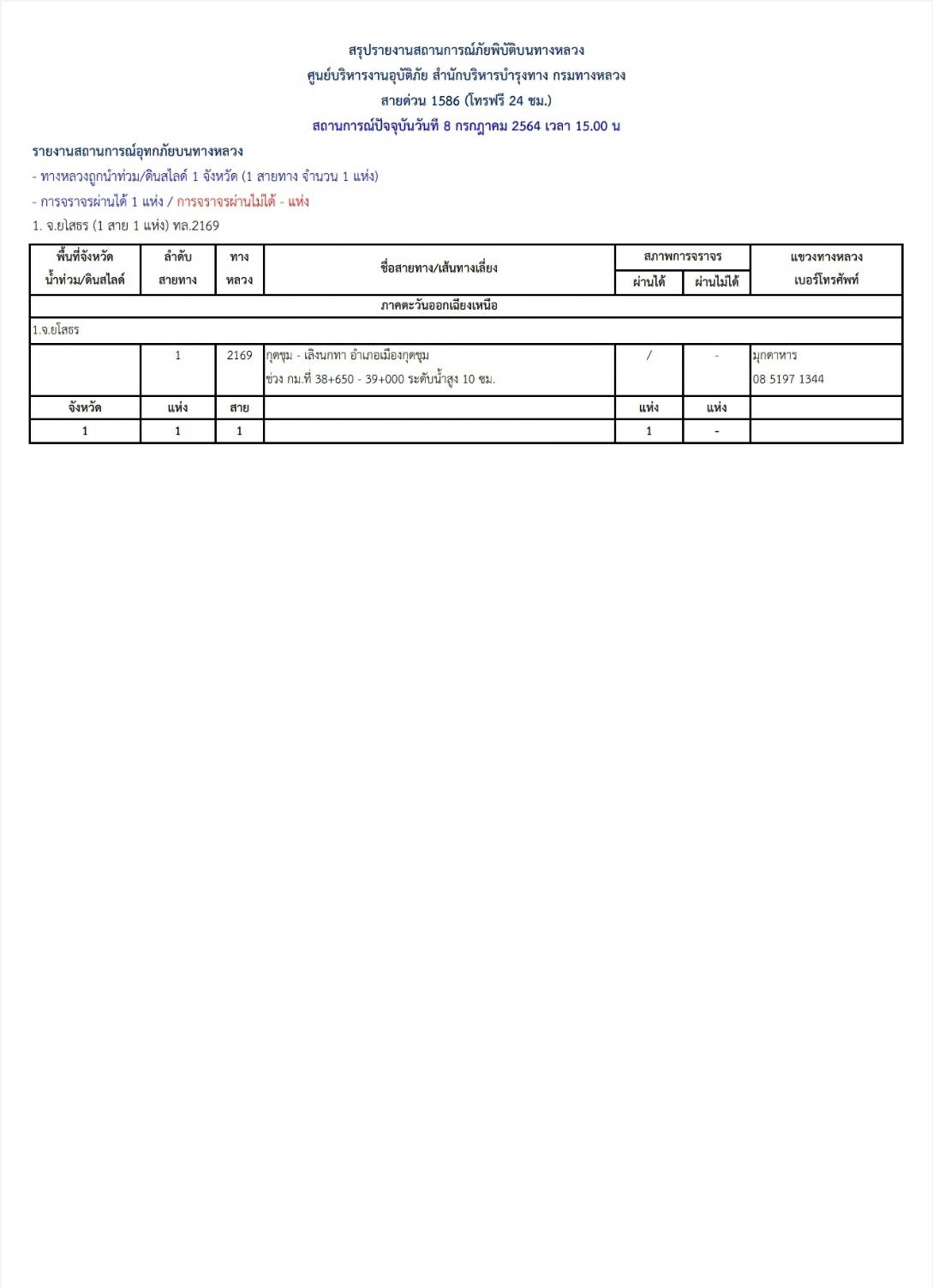สรุปสถานการณ์อุทกภัยบนทางหลวง วันที่ 8 กรกฎาคม 2564 เวลา 15.00 น.