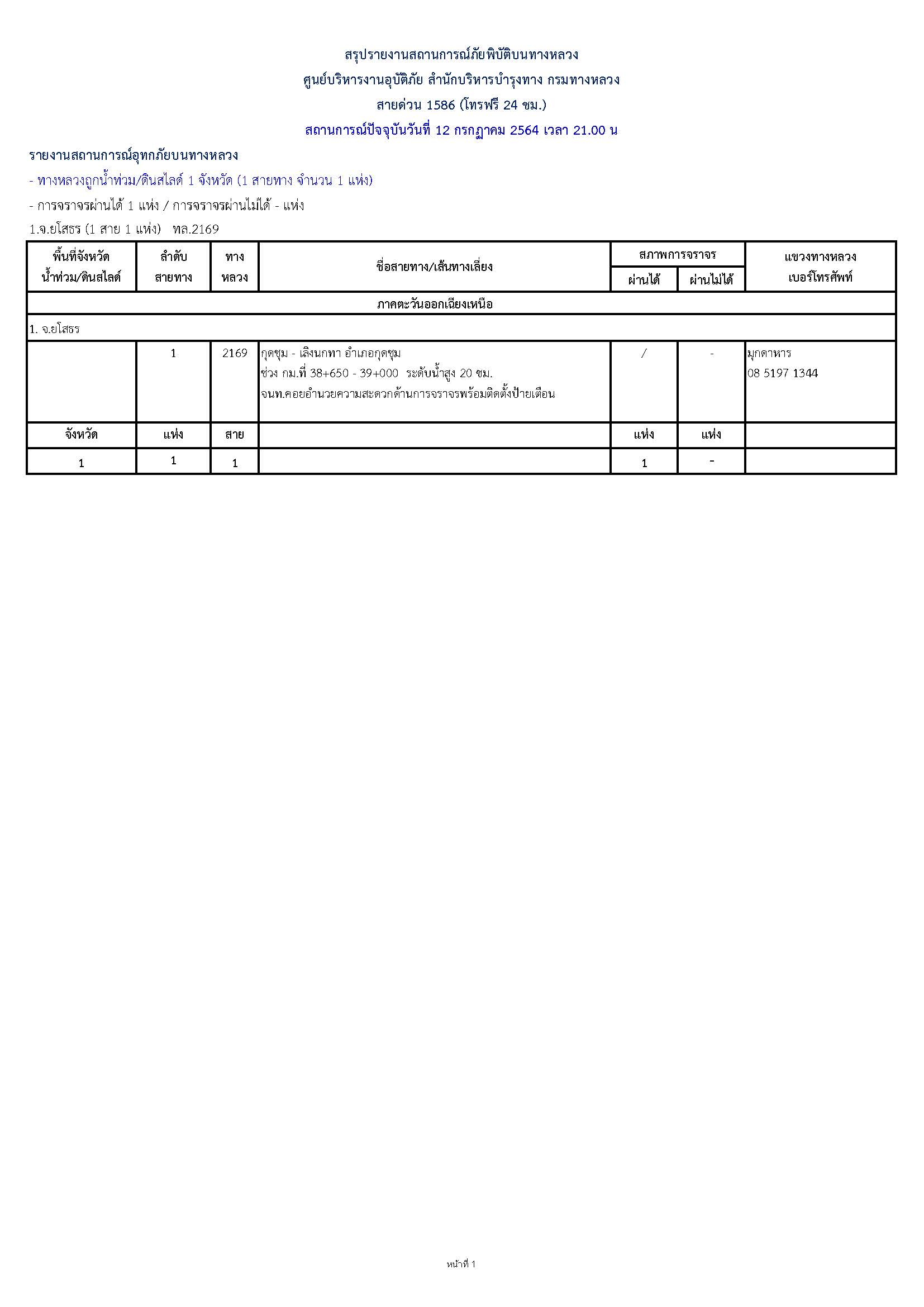 กรมทางหลวงขอรายงานสถานการณ์ น้ำท่วม และดินสไลด์ ในโครงข่ายทางหลวง วันจันทร์ที่ 12 กรกฎาคม 2564 เวลา 21.00 น. ดังนี้