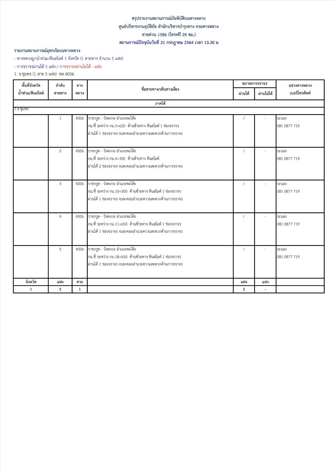 กรมทางหลวงขอรายงานสถานการณ์ น้ำท่วม และดินสไลด์ ในโครงข่ายทางหลวง