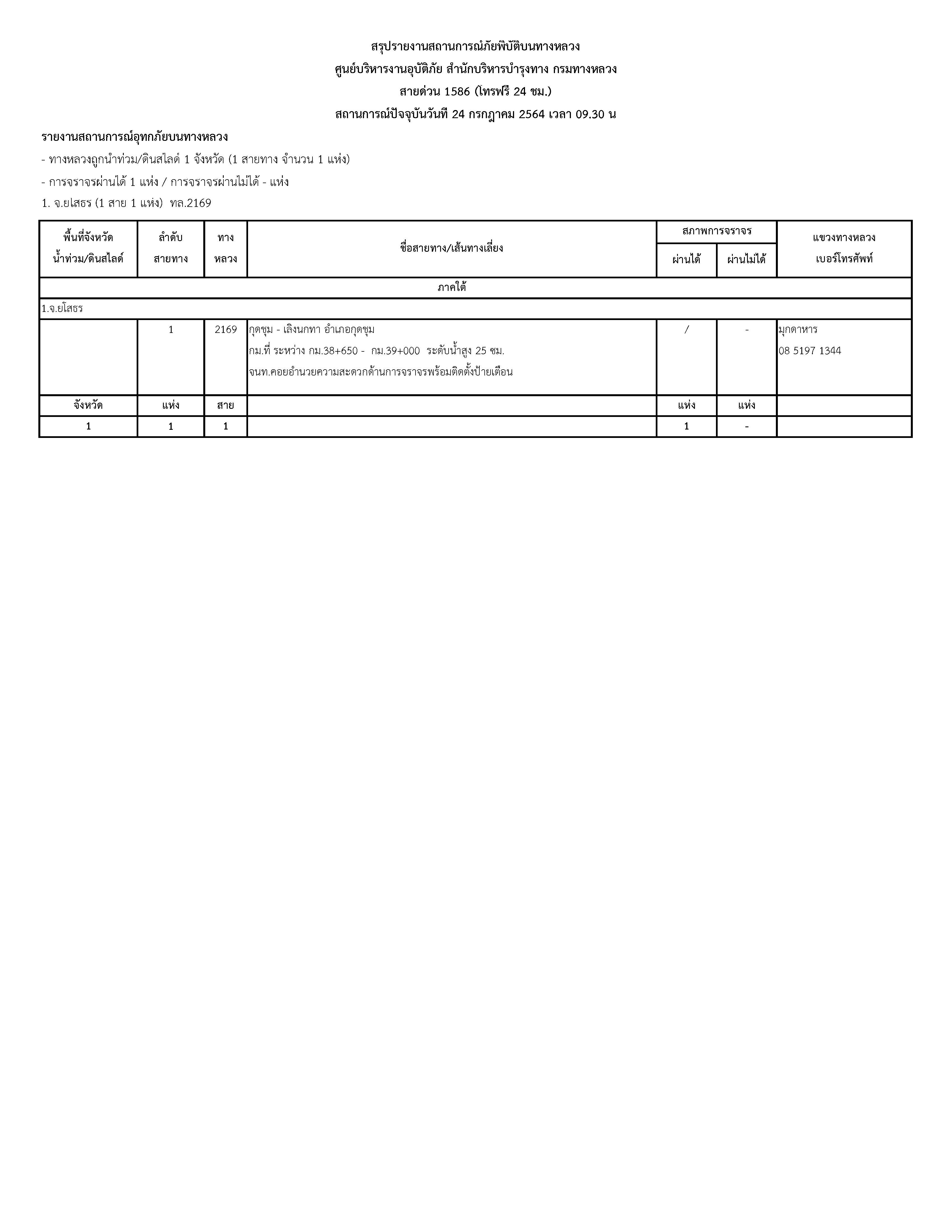 กรมทางหลวงขอรายงานสถานการณ์ น้ำท่วม และดินสไลด์ ในโครงข่ายทางหลวง วันเสาร์ที่ 24 กรกฎาคม 2564 เวลา 09.30 น. ดังนี้