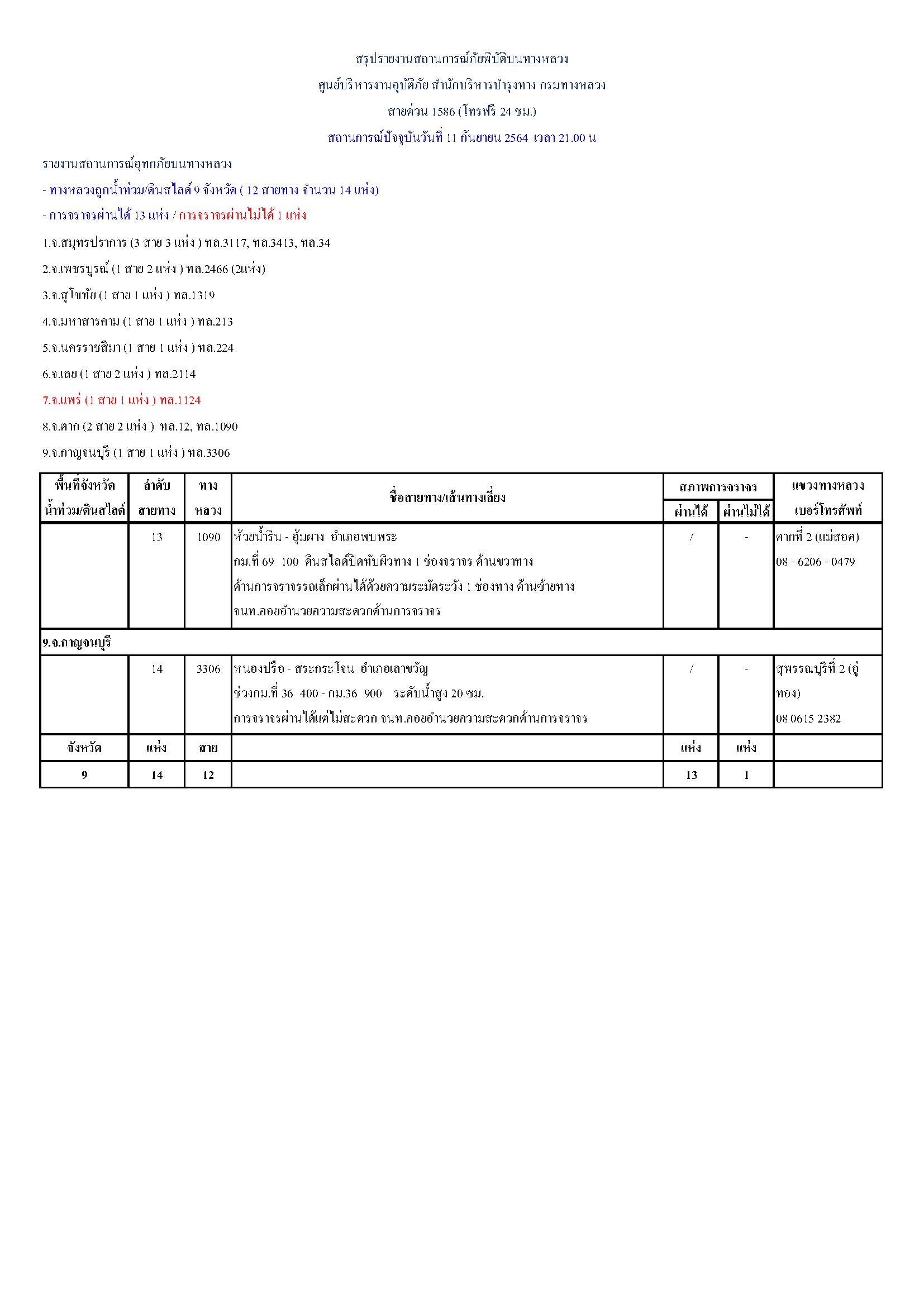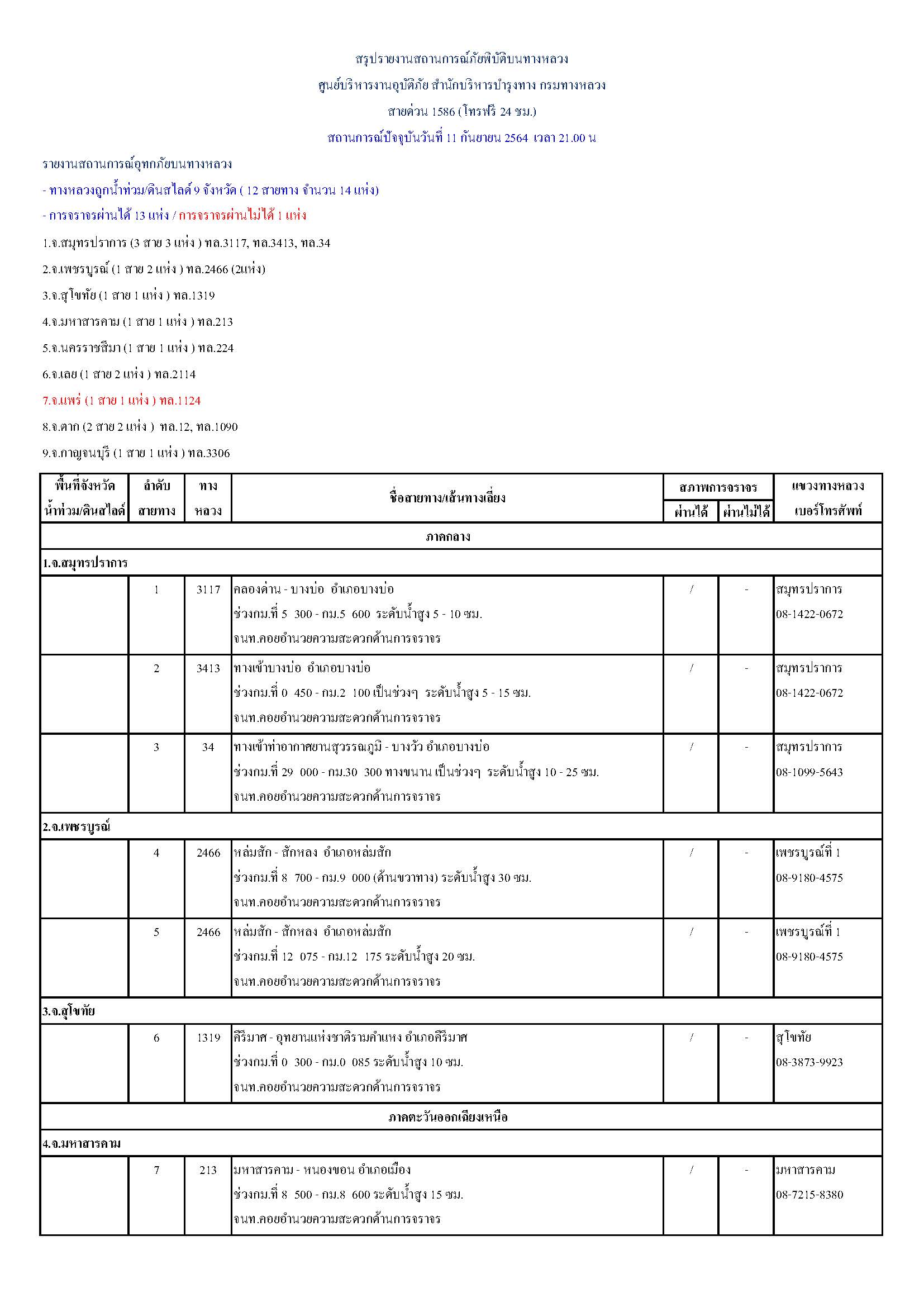 กรมทางหลวงขอรายงานสถานการณ์ น้ำท่วม และดินสไลด์ ในโครงข่ายทางหลวง วันเสาร์ที่ 11 กันยายน 2564 เวลา 21.00 น. ดังนี้
