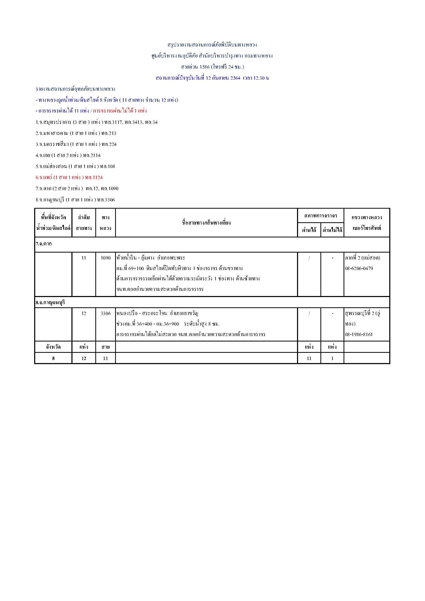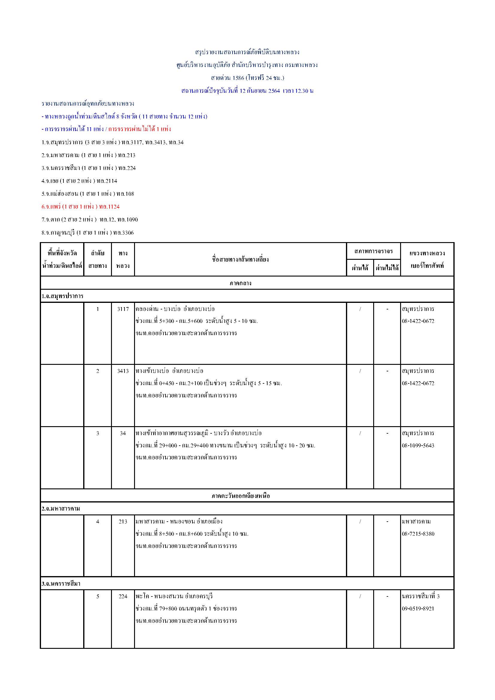 กรมทางหลวงขอรายงานสถานการณ์ น้ำท่วม และดินสไลด์ ในโครงข่ายทางหลวง วันเสาร์ที่ 12 กันยายน 2564 เวลา 12.30 น. ดังนี้