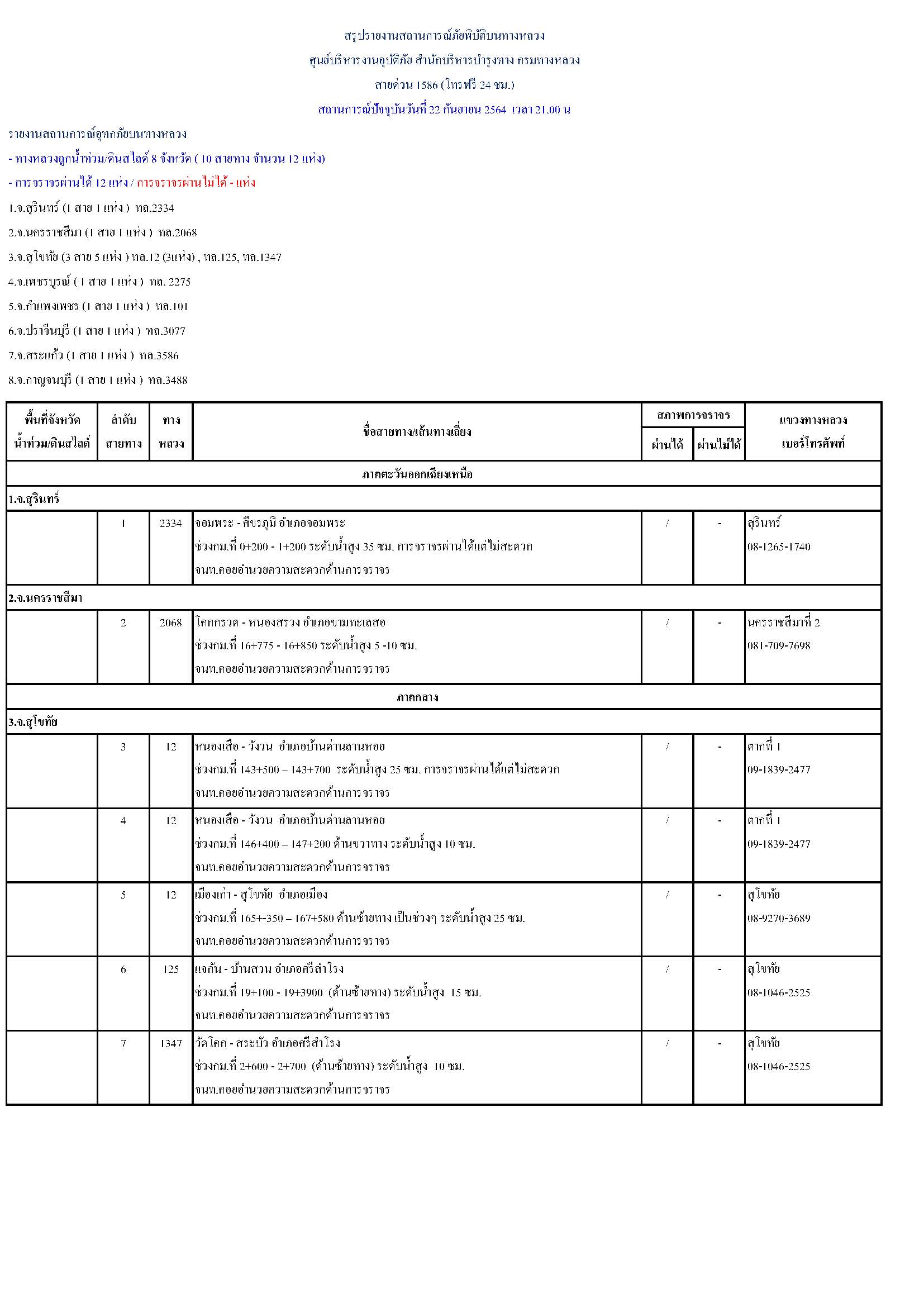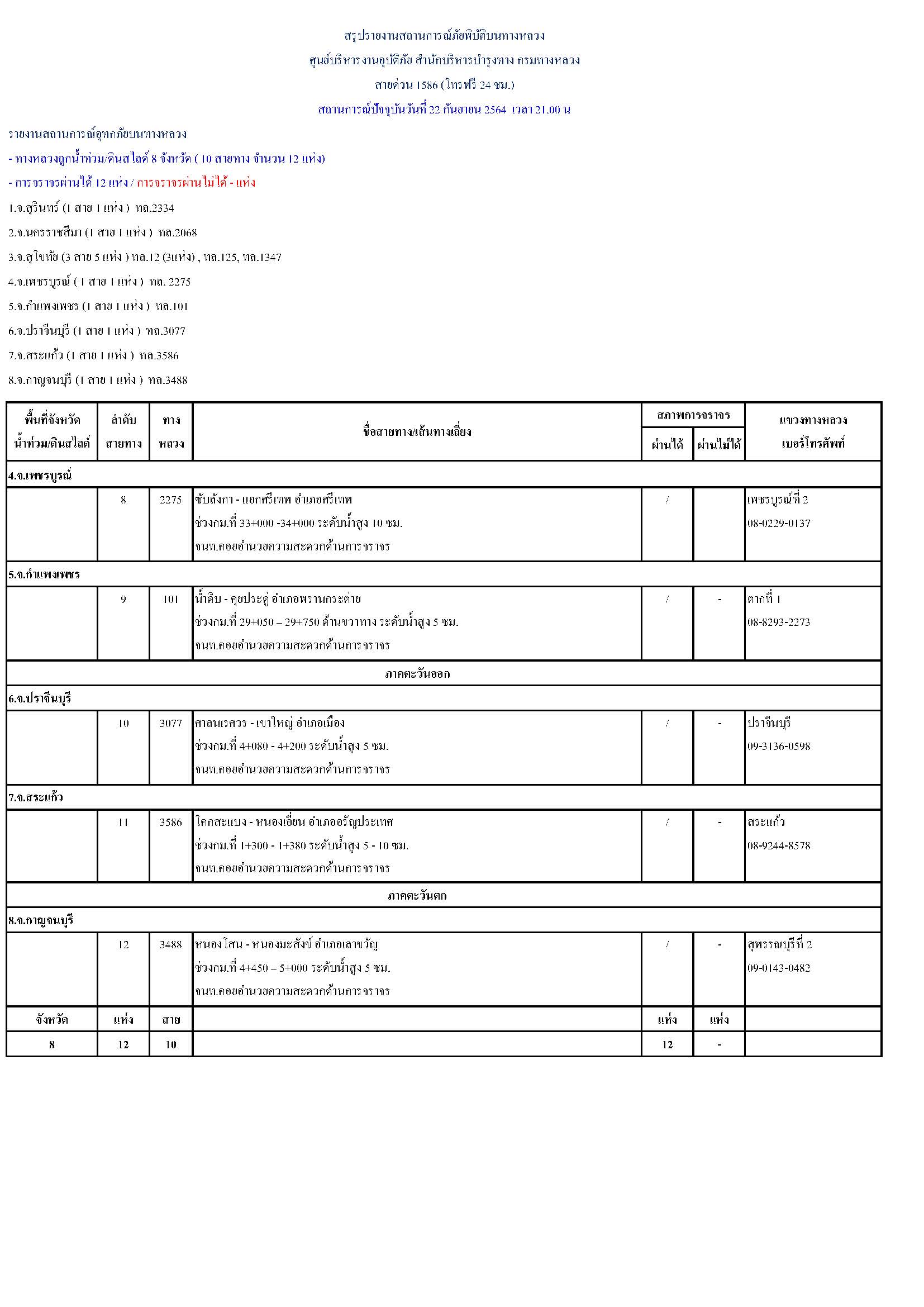 กรมทางหลวงขอรายงานสถานการณ์ น้ำท่วม และดินสไลด์ ในโครงข่ายทางหลวง วันพุธที่ 22 กันยายน 2564 เวลา21.00 น. ดังนี้