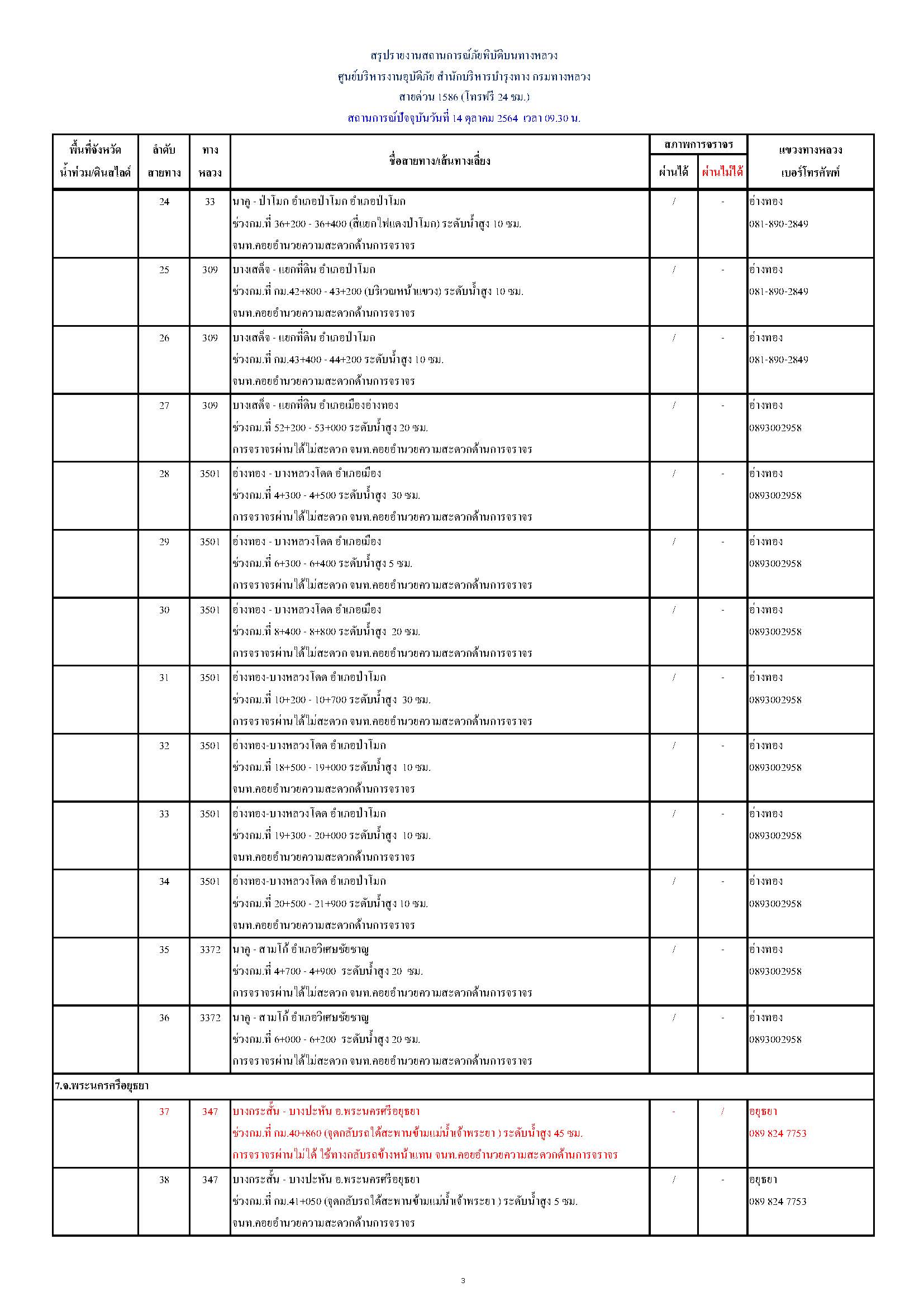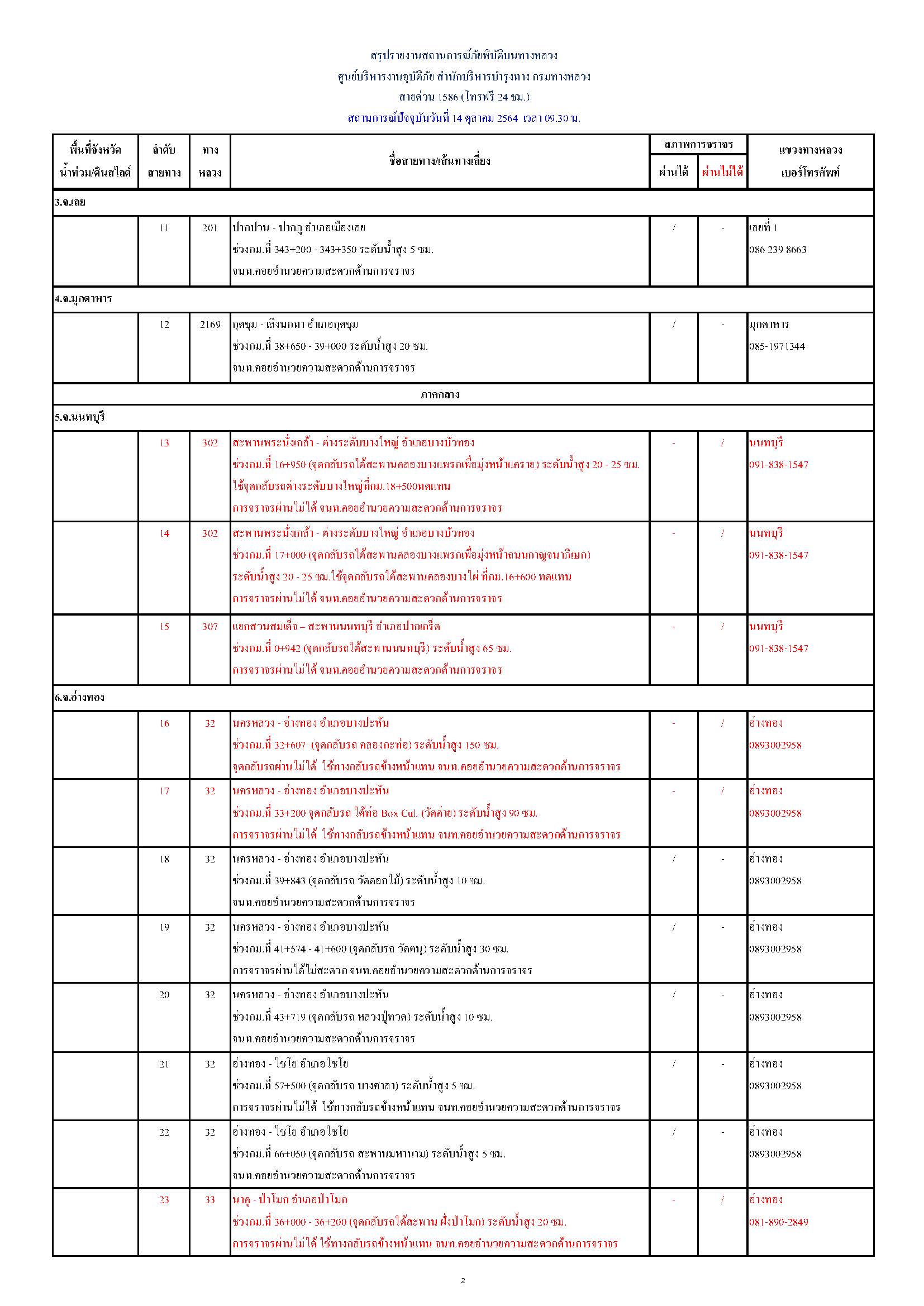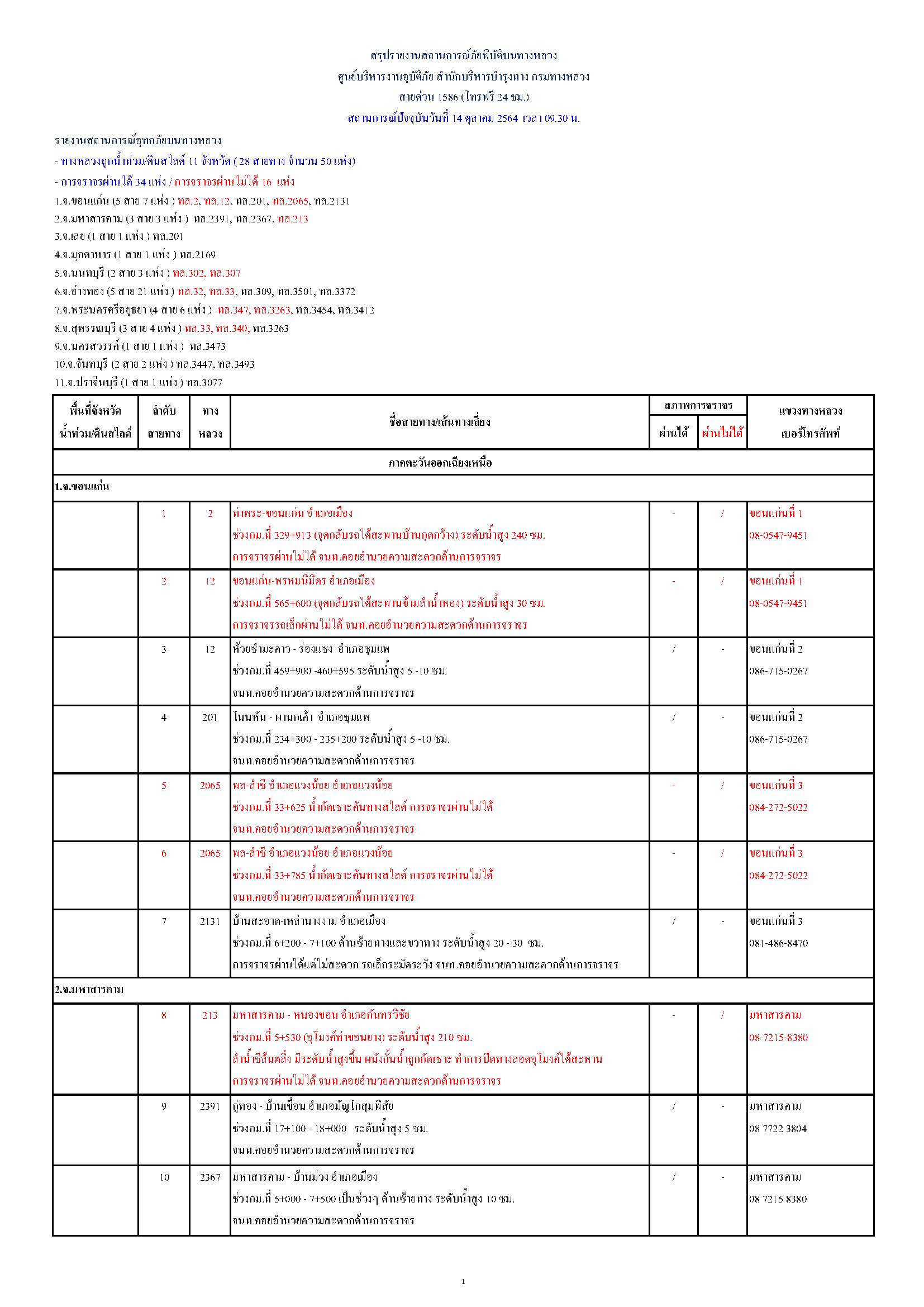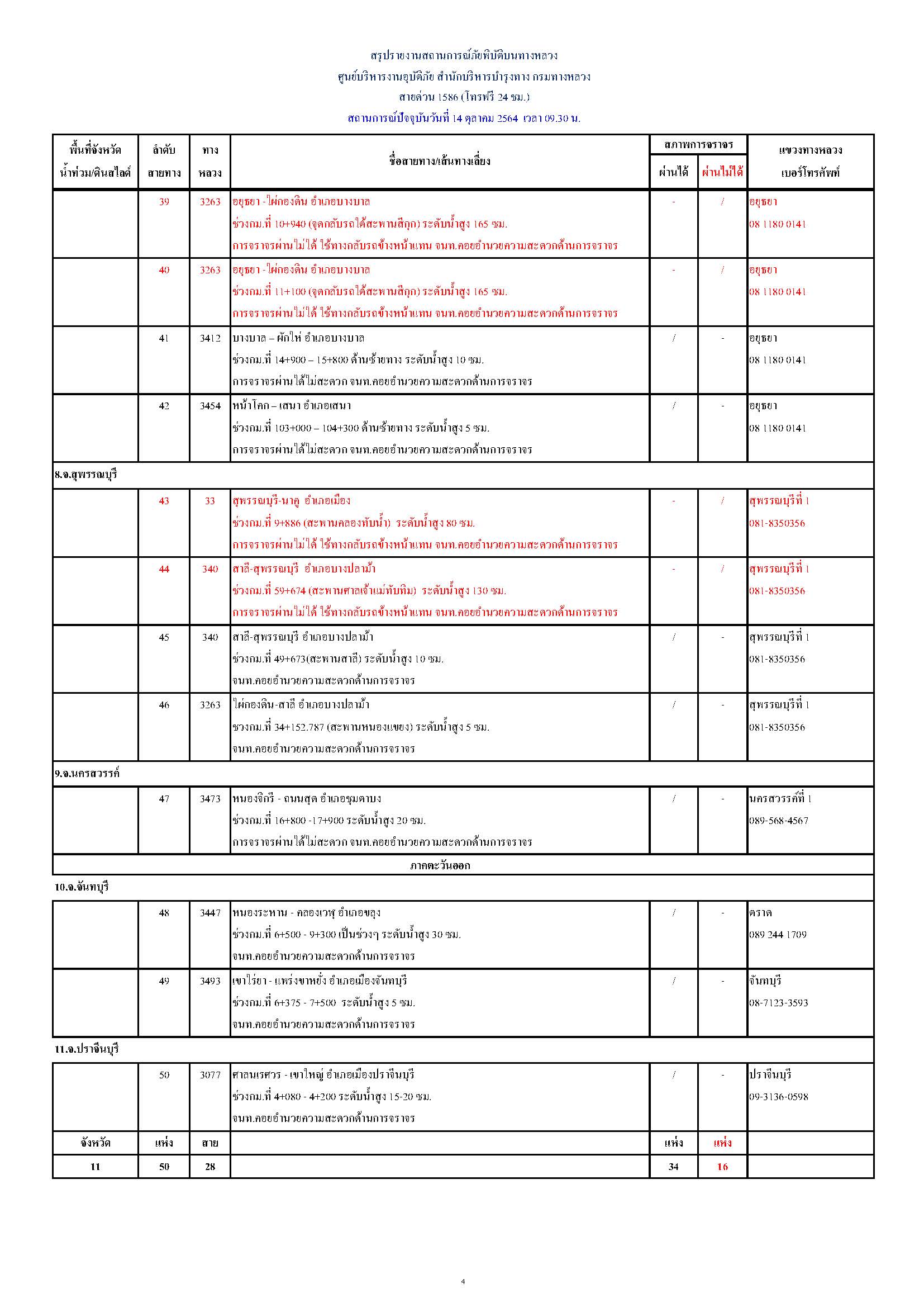 กรมทางหลวงขอรายงานสถานการณ์ น้ำท่วม และดินสไลด์ ในโครงข่ายทางหลวง วันพฤหัสบดีที่ 14 ตุลาคม 2564 เวลา 09.30 น. ดังนี้
