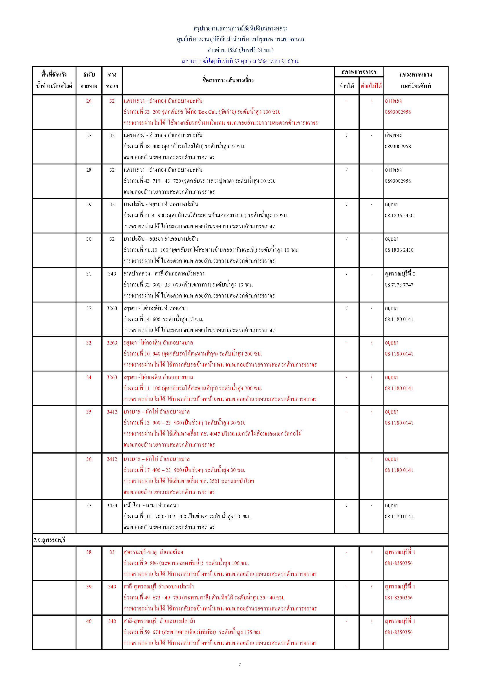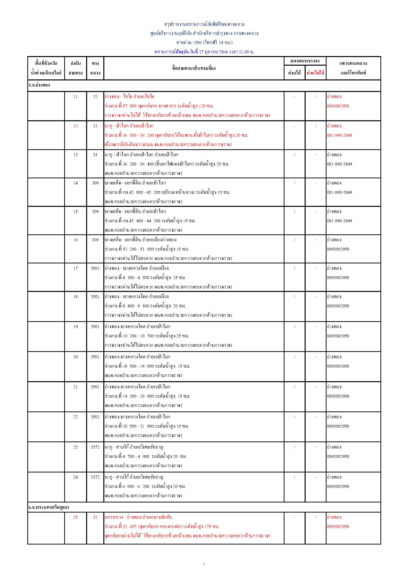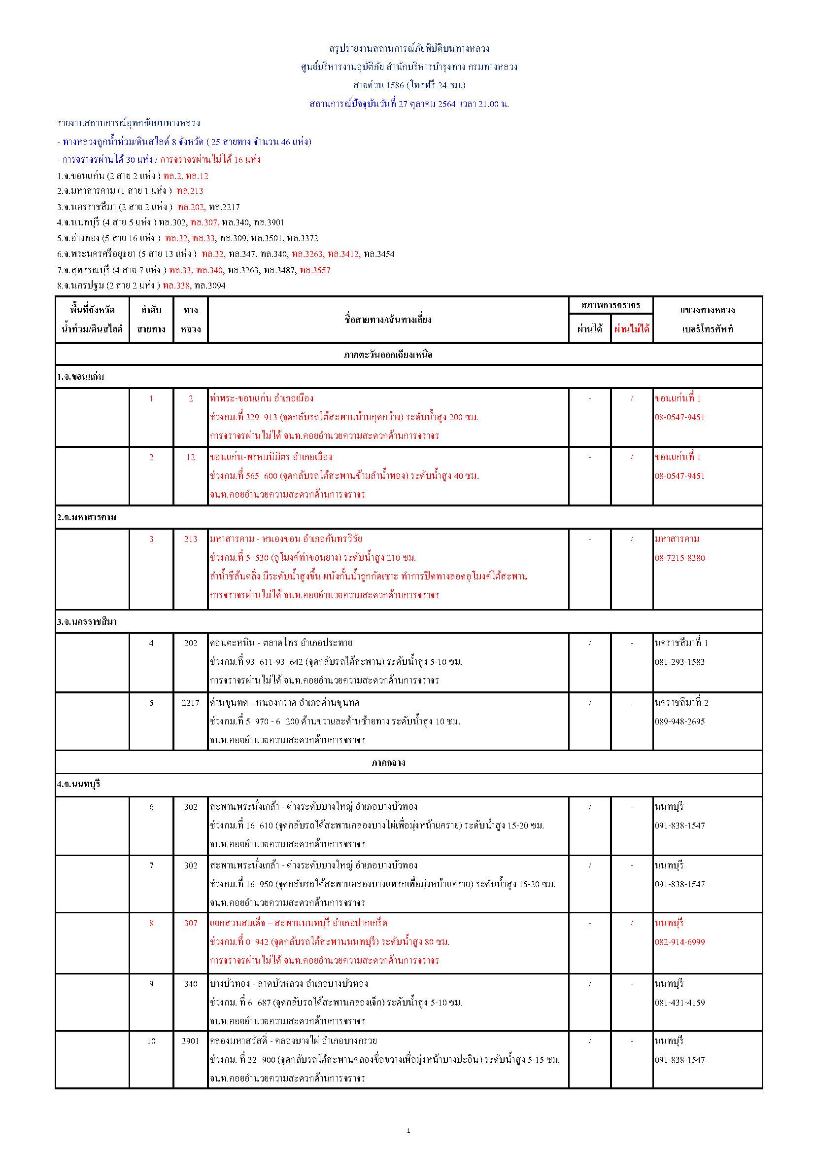 กรมทางหลวงขอรายงานสถานการณ์ น้ำท่วม และดินสไลด์ ในโครงข่ายทางหลวง วันพุธที่ 27 ตุลาคม 2564 เวลา 21.00 น. ดังนี้