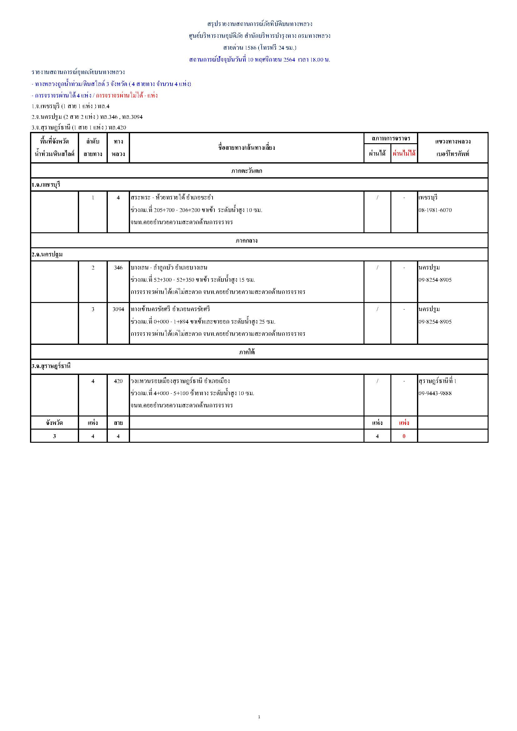 กรมทางหลวงขอรายงานสถานการณ์ น้ำท่วม และดินสไลด์ ในโครงข่ายทางหลวง วันพุธที่ 10 พฤศจิกายน 2564 เวลา 18.00 น. ดังนี้