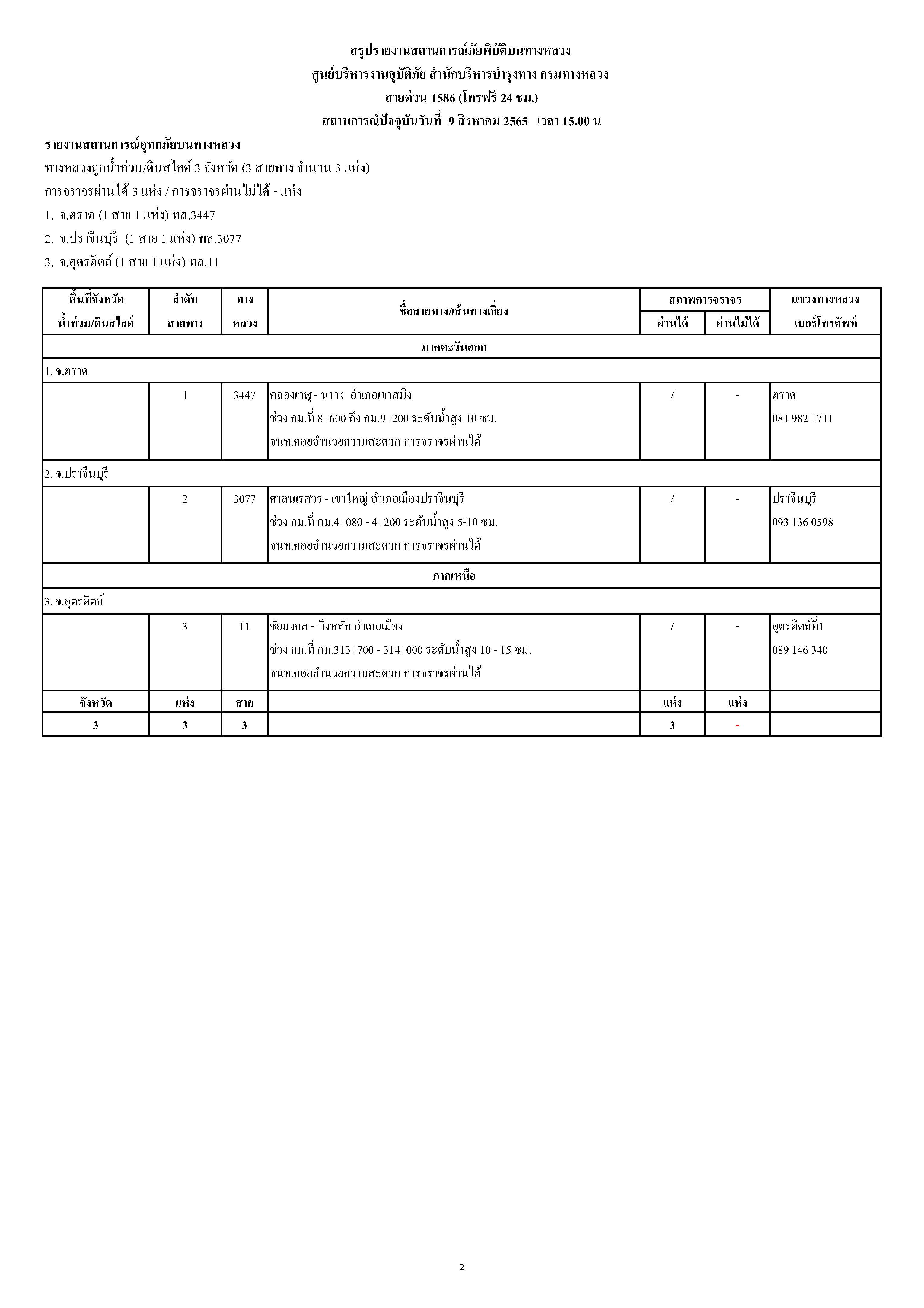 กรมทางหลวงขอรายงานสถานการณ์ น้ำท่วม และดินสไลด์ ในโครงข่ายทางหลวง วันอังคารที่ 9 สิงหาคม 2565 เวลา 15.00 น. ดังนี้