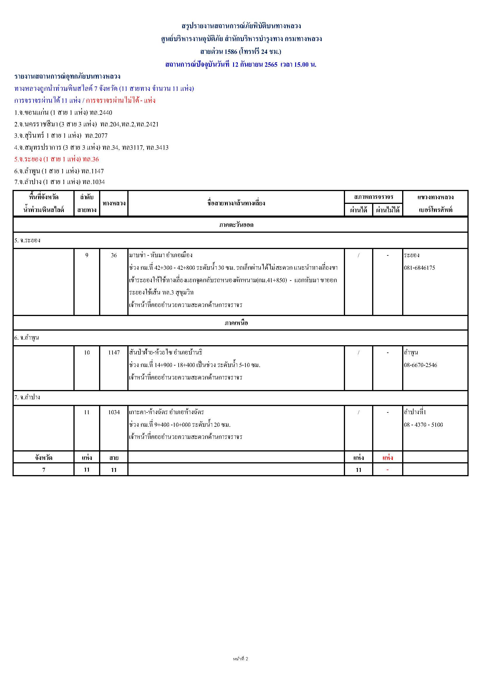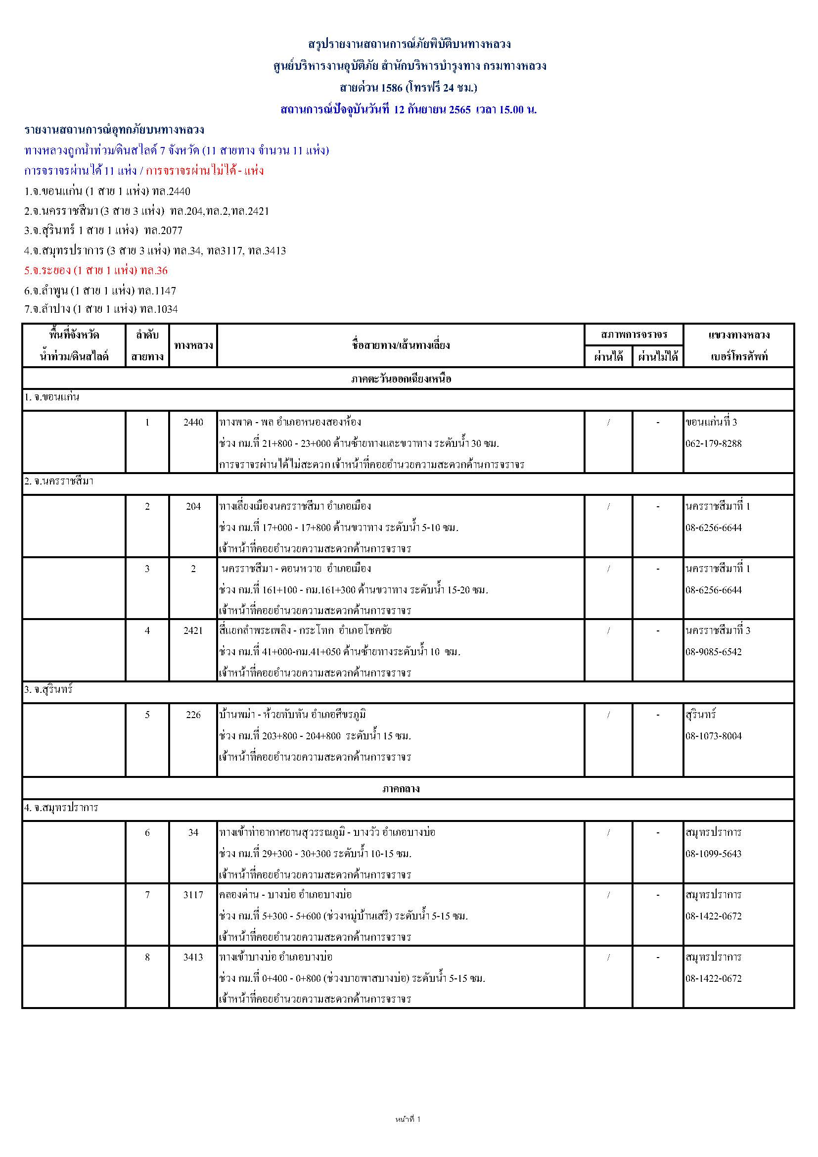 กรมทางหลวงขอรายงานสถานการณ์ น้ำท่วม และดินสไลด์ ในโครงข่ายทางหลวง วันจันทร์ที่ 12 กันยายน 2565 เวลา 15.00น. ดังนี้