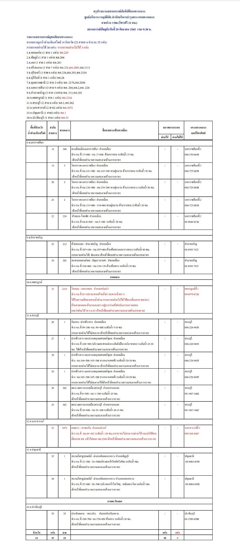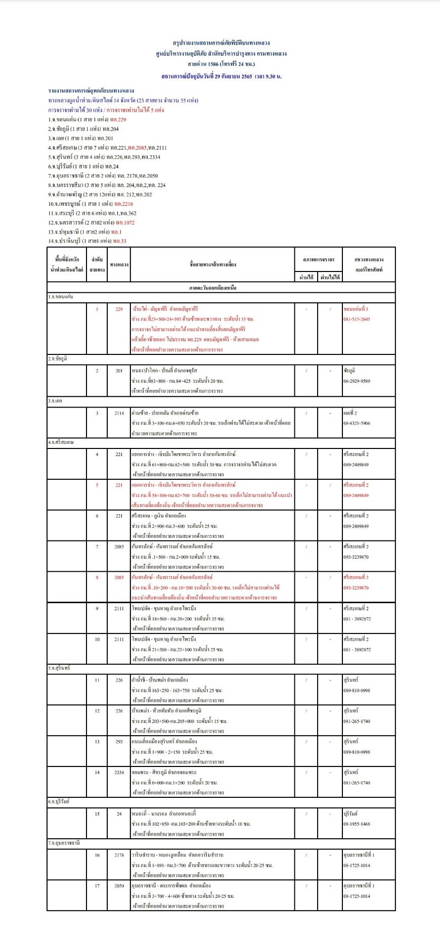 กรมทางหลวงขอรายงานสถานการณ์ น้ำท่วม และดินสไลด์ ในโครงข่ายทางหลวง วันพฤหัสบดีที่ 29 กันยายน 2565 เวลา 09.30 น. ดังนี้