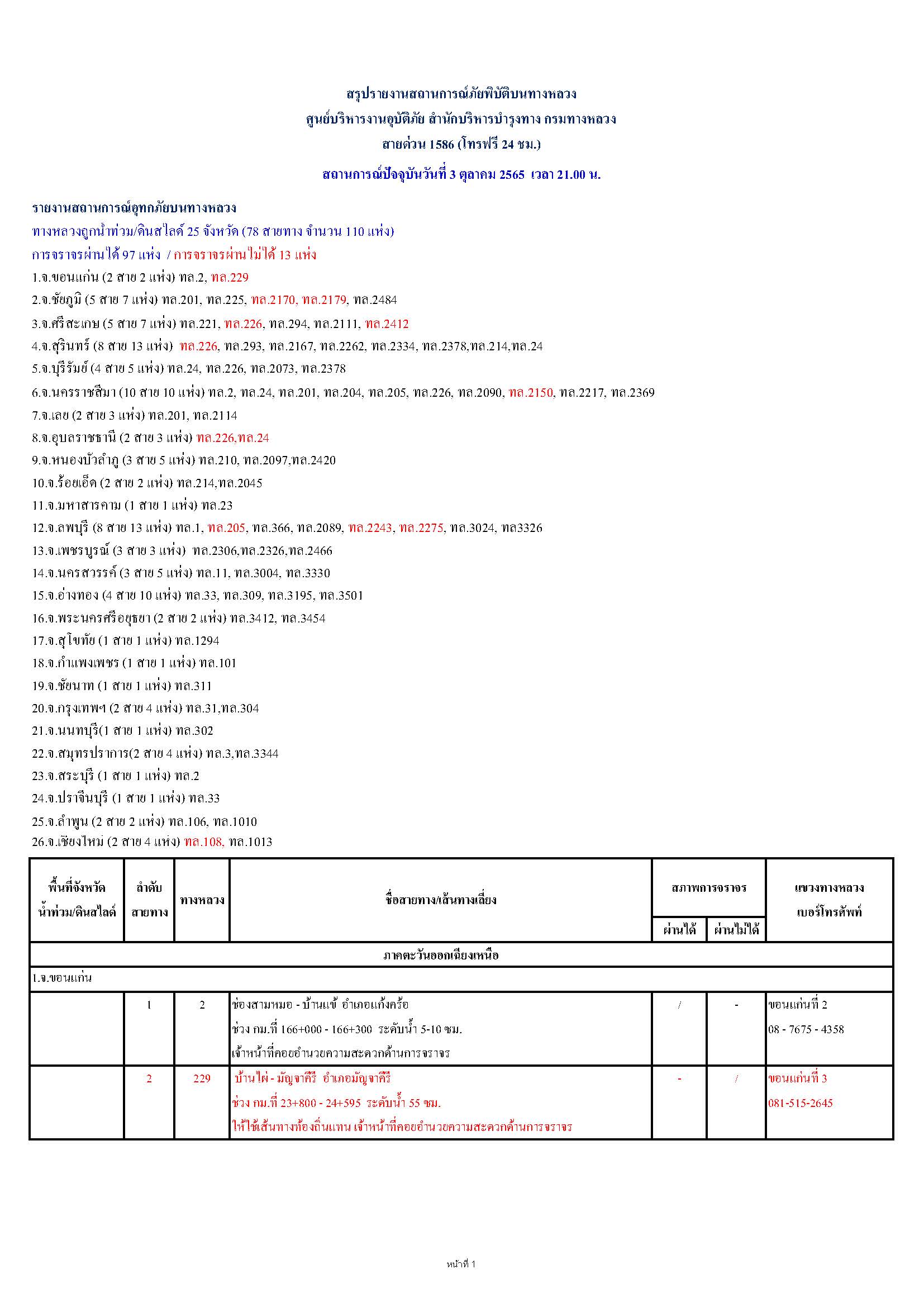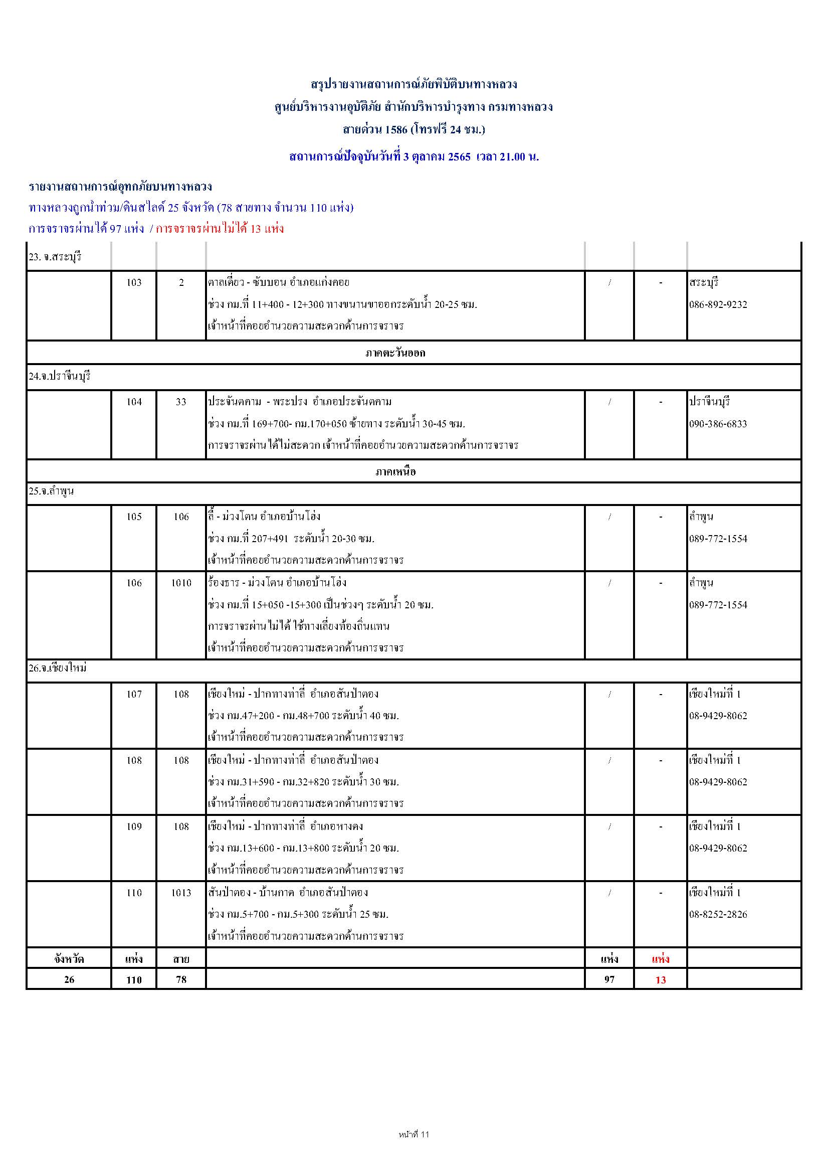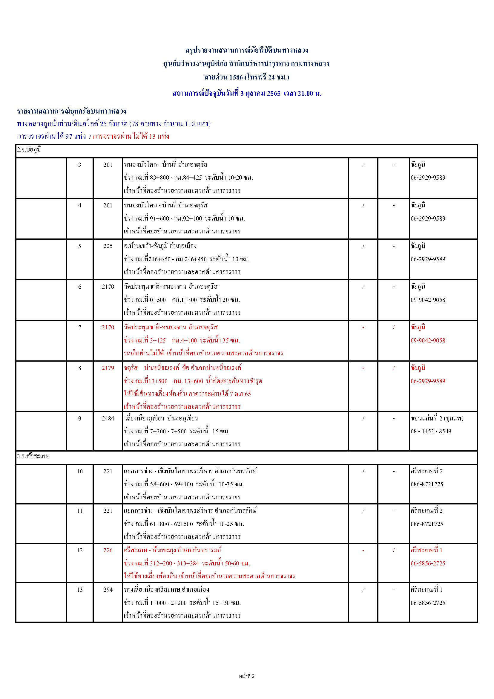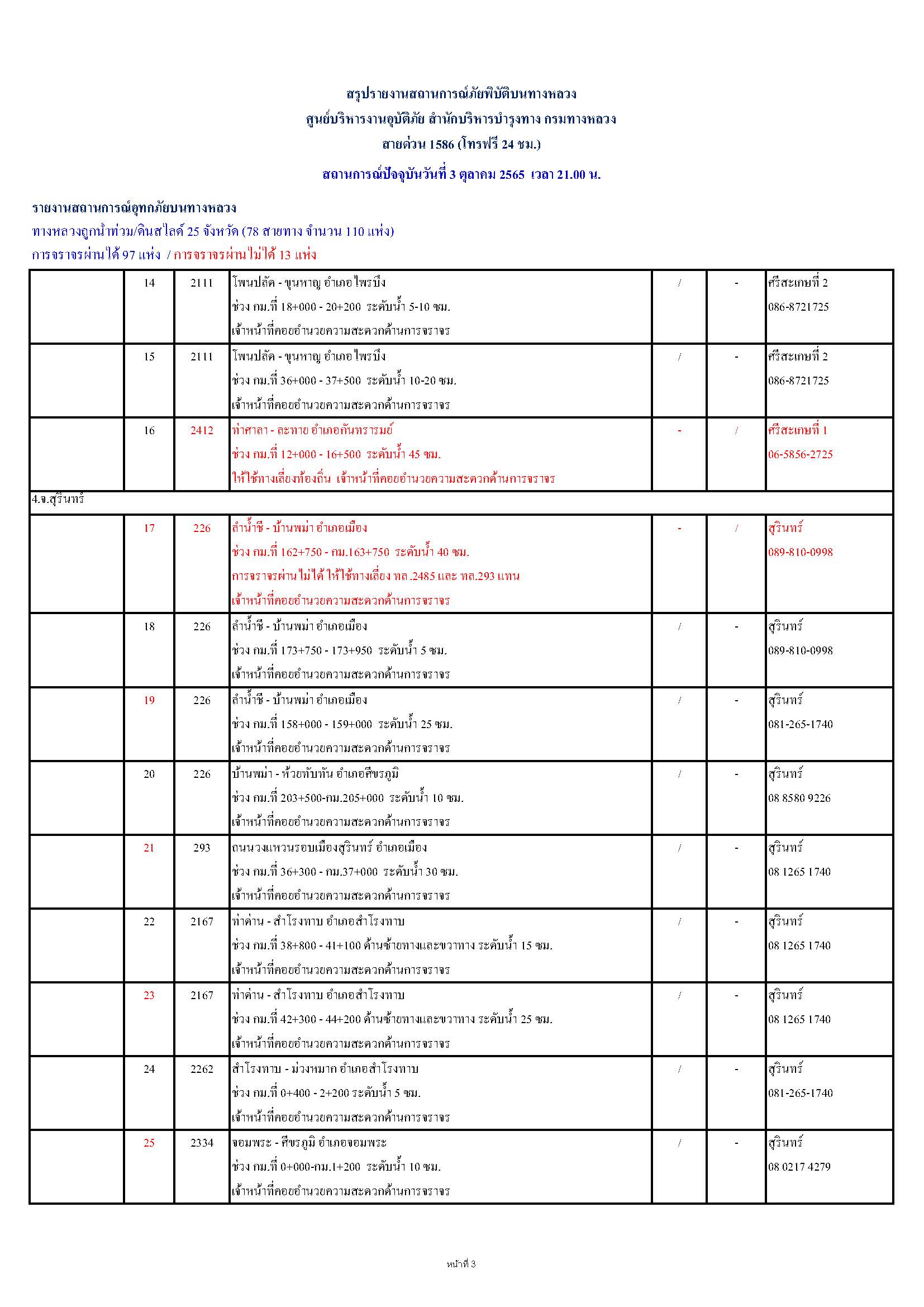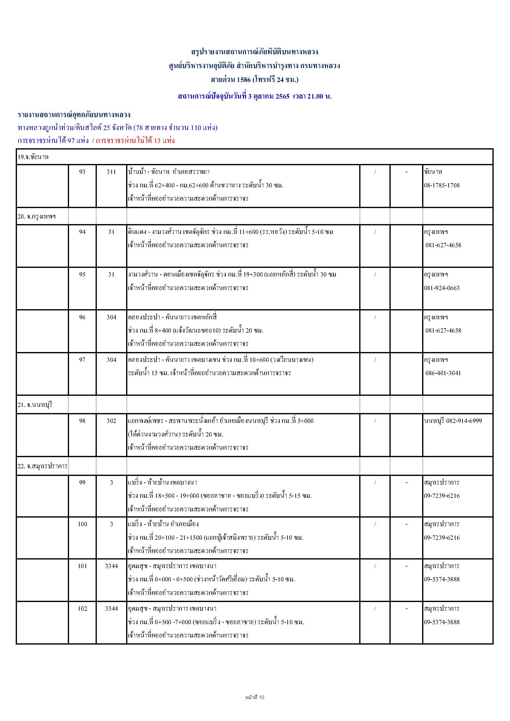 กรมทางหลวงขอรายงานสถานการณ์ น้ำท่วม และดินสไลด์ ในโครงข่ายทางหลวง วันจันทร์ที่ 3 ตุลาคม 2565 เวลา 21.00 น. ดังนี้