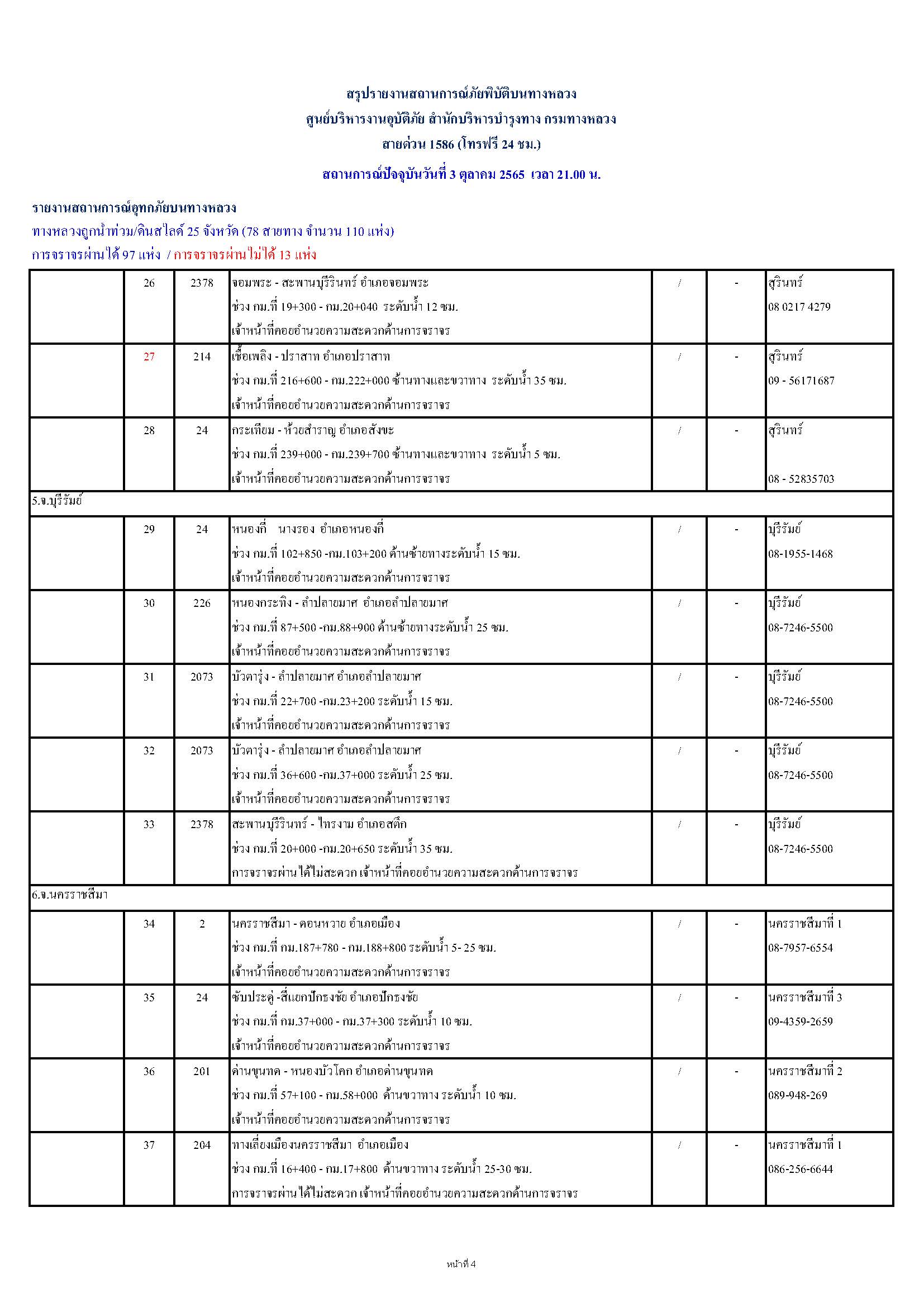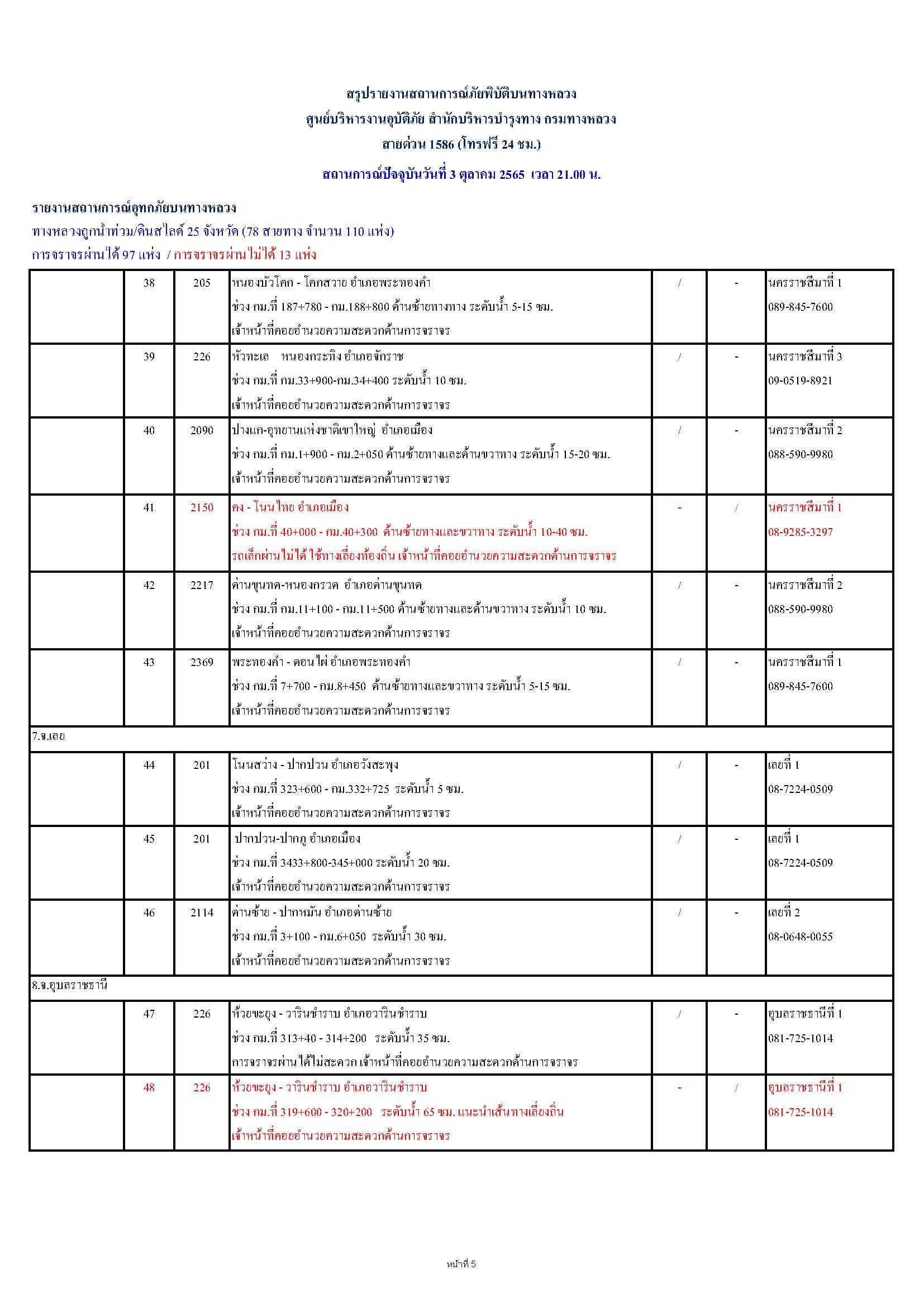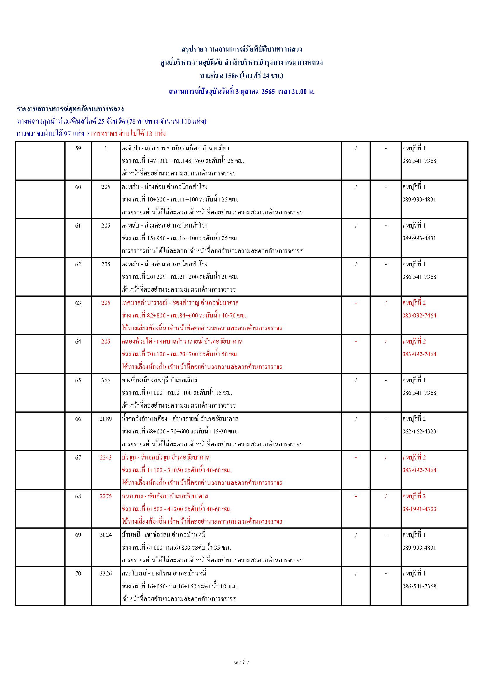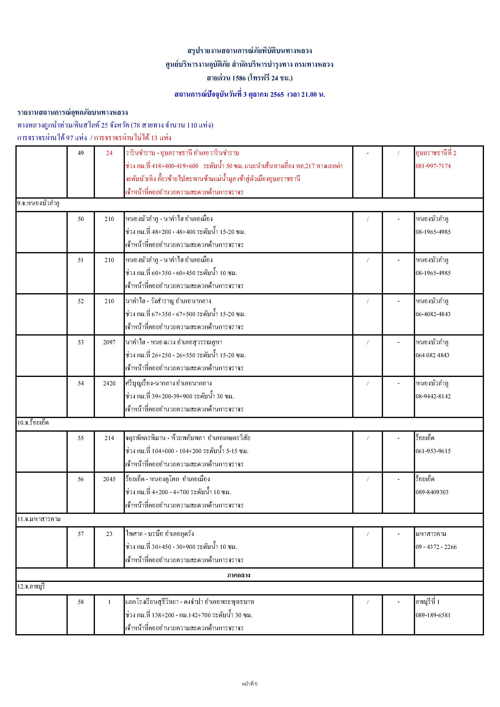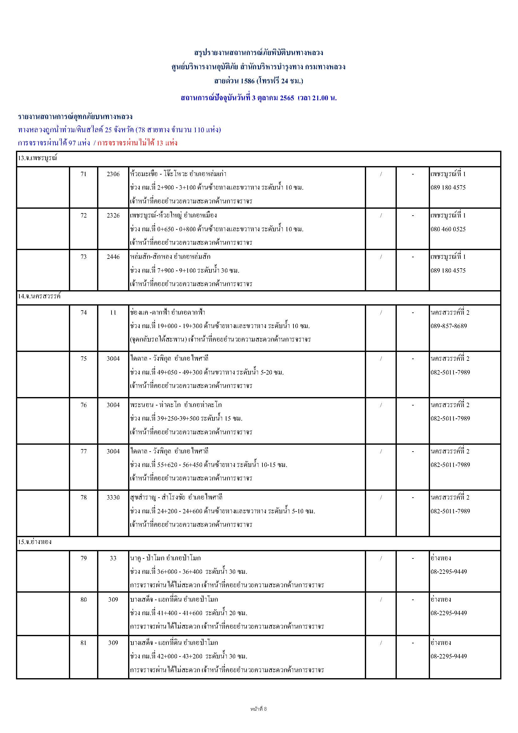 กรมทางหลวงขอรายงานสถานการณ์ น้ำท่วม และดินสไลด์ ในโครงข่ายทางหลวง วันจันทร์ที่ 3 ตุลาคม 2565 เวลา 21.00 น. ดังนี้