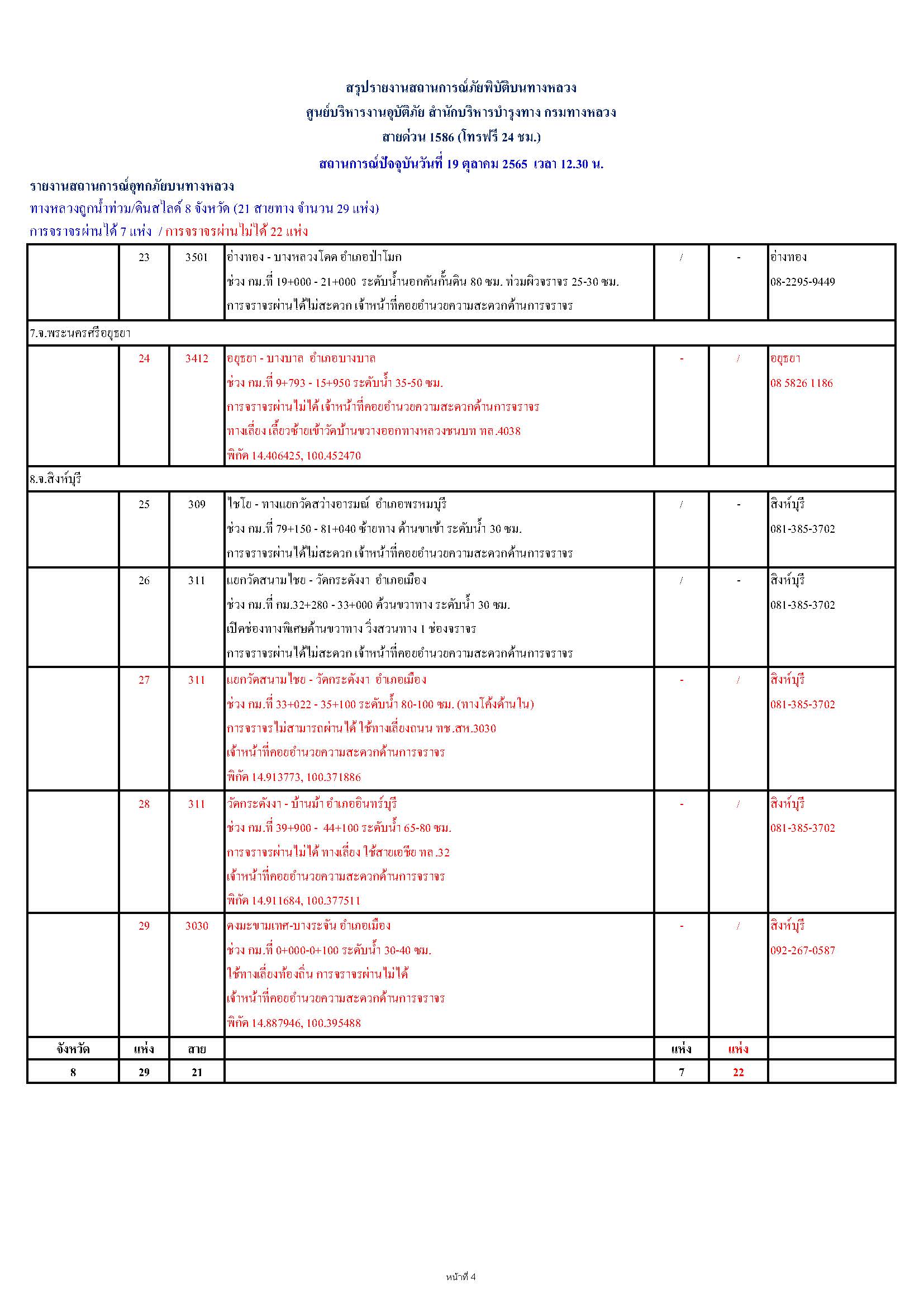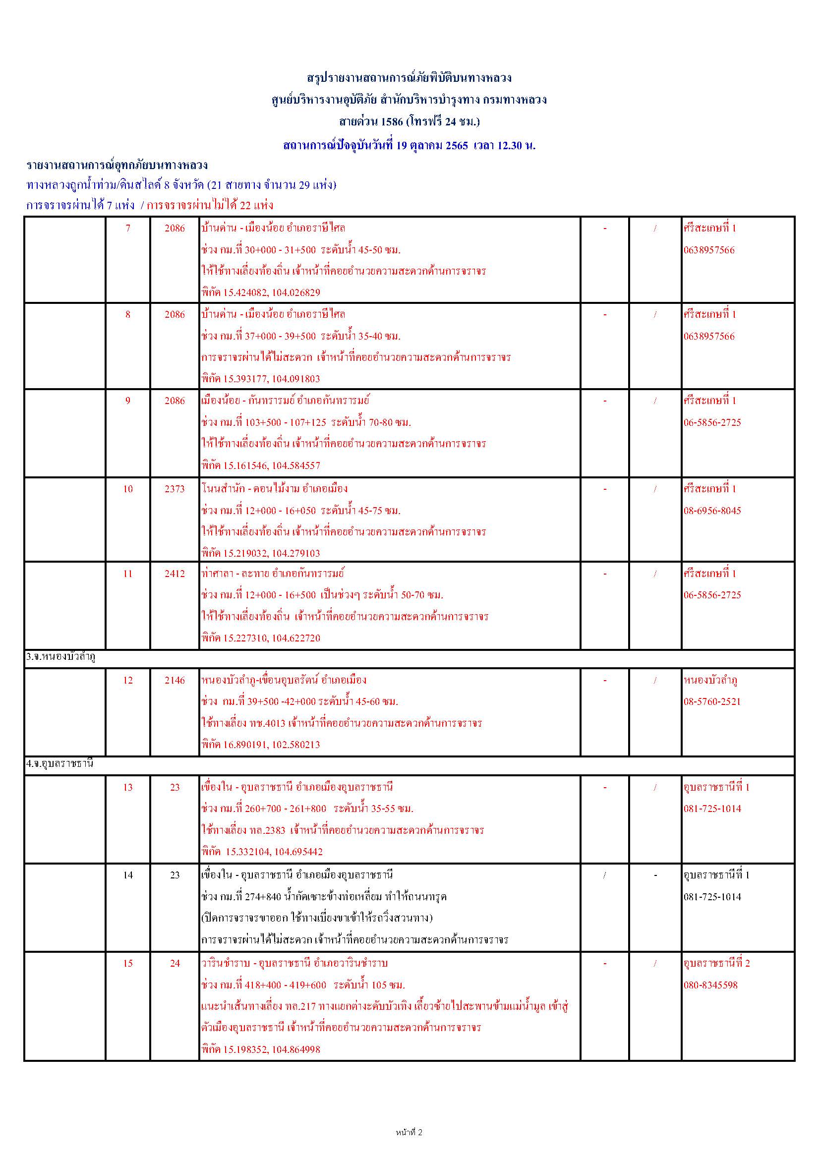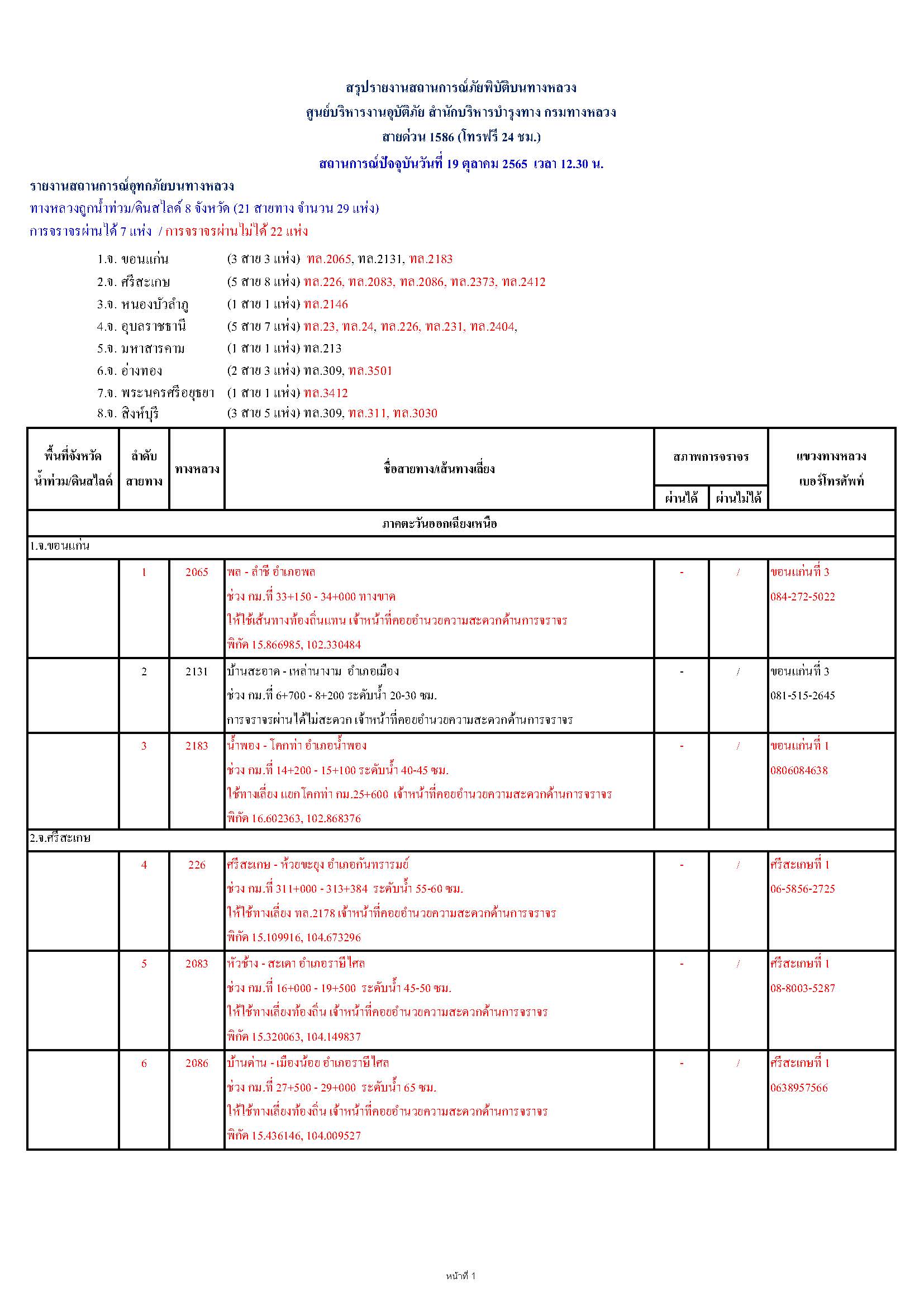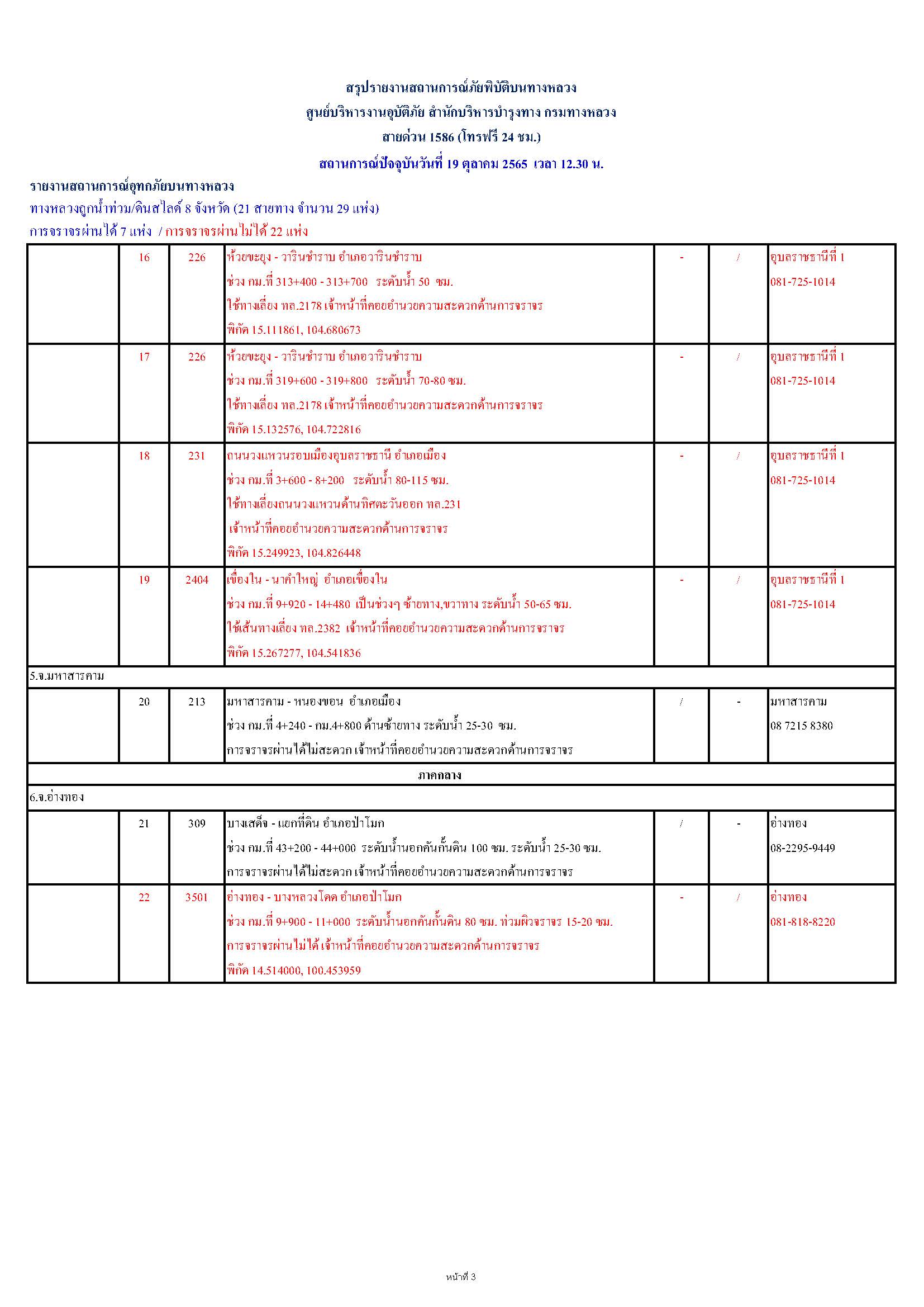 กรมทางหลวงขอรายงานสถานการณ์ น้ำท่วม และดินสไลด์ ในโครงข่ายทางหลวง วันพุธที่ 19 ตุลาคม 2565 เวลา 12.30 น. ดังนี้