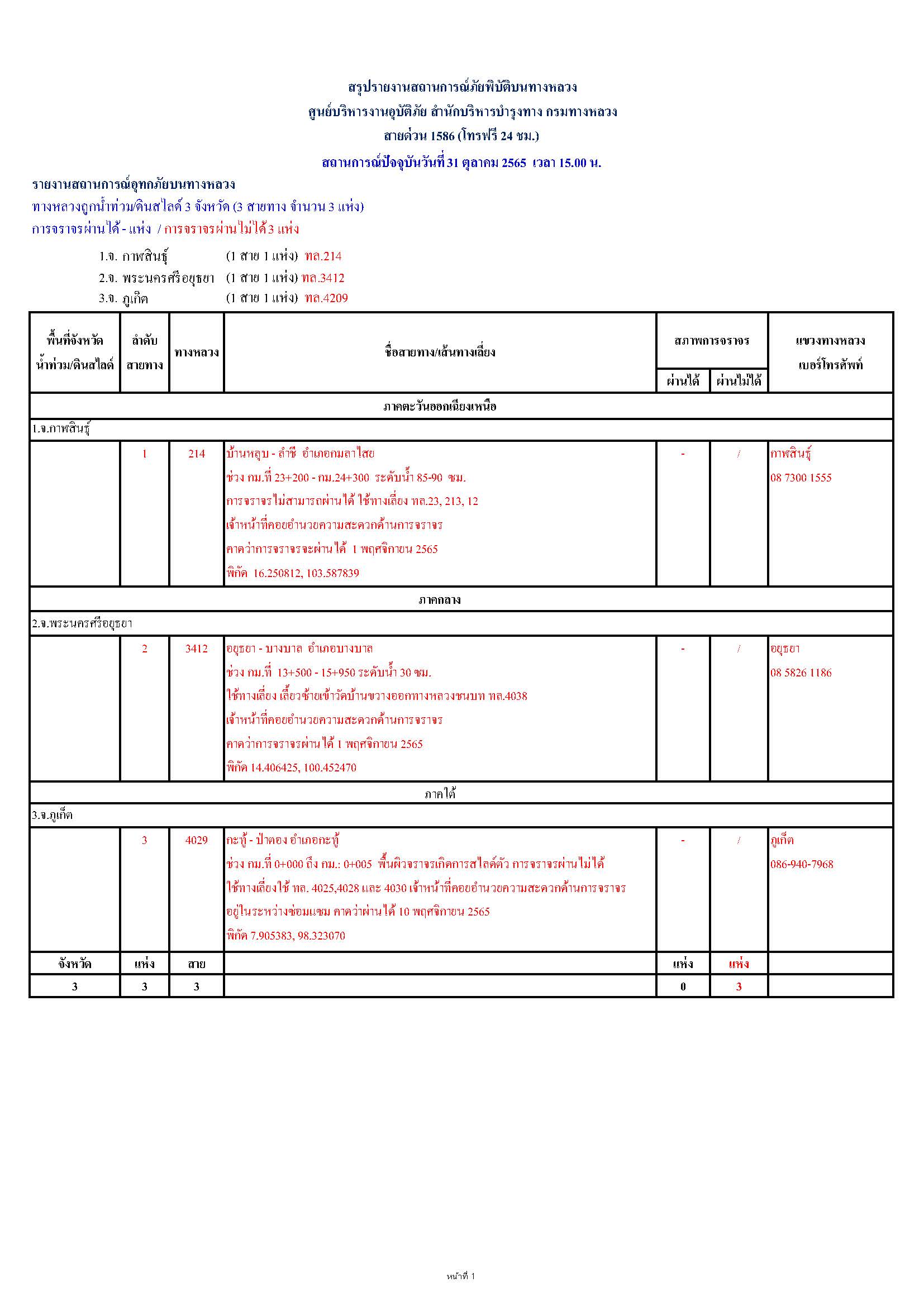 กรมทางหลวงขอรายงานสถานการณ์ น้ำท่วม และดินสไลด์ ในโครงข่ายทางหลวง วันจันทร์ ที่ 31 ตุลาคม 2565 เวลา 15.00 น. ดังนี้