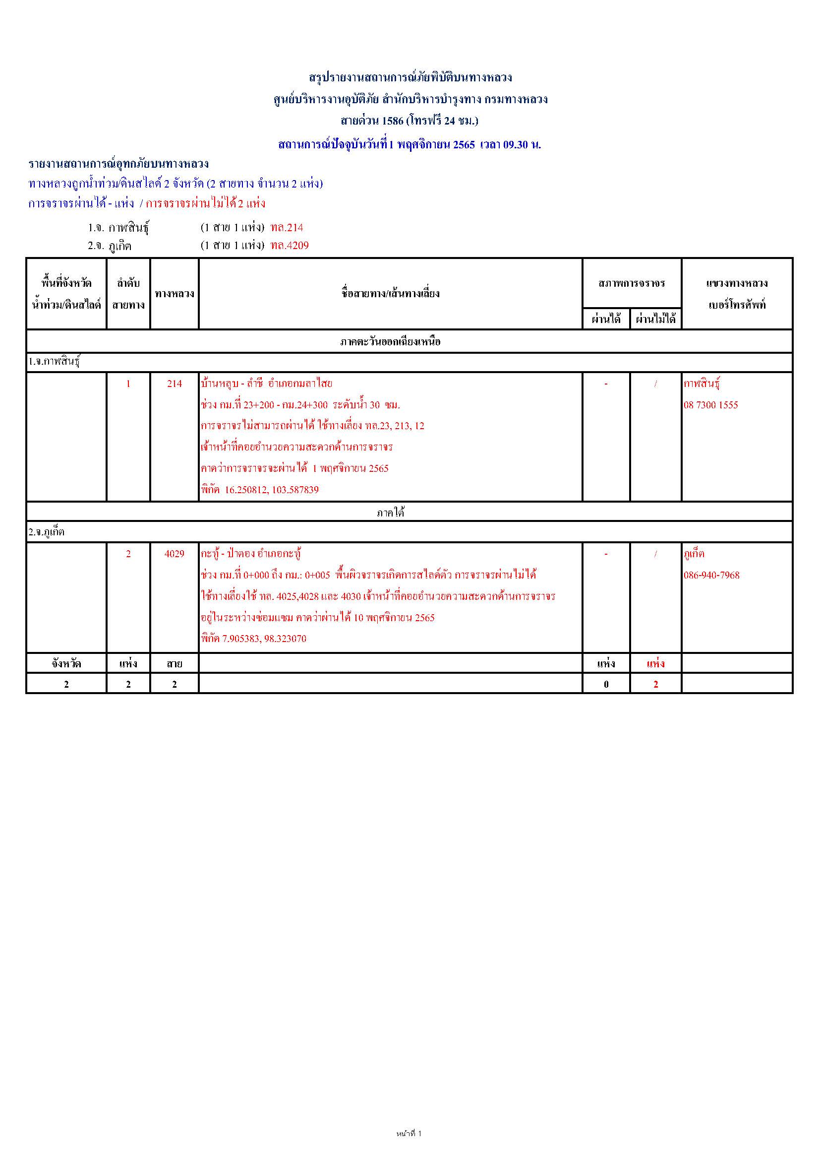 กรมทางหลวงขอรายงานสถานการณ์ น้ำท่วม และดินสไลด์ ในโครงข่ายทางหลวง วันอังคารที่ 1 พฤศจิกายน 2565 เวลา 09.30 น. ดังนี้