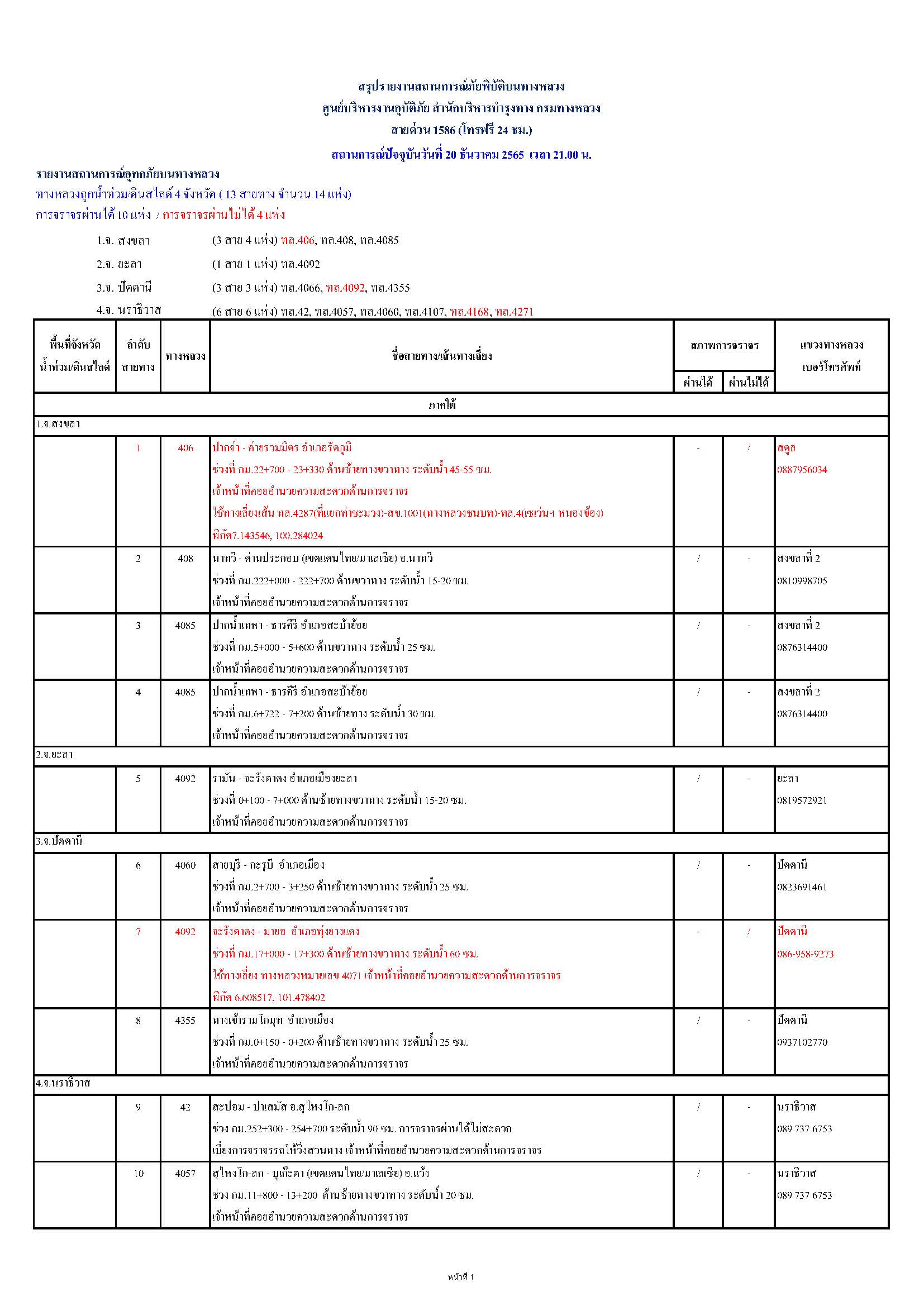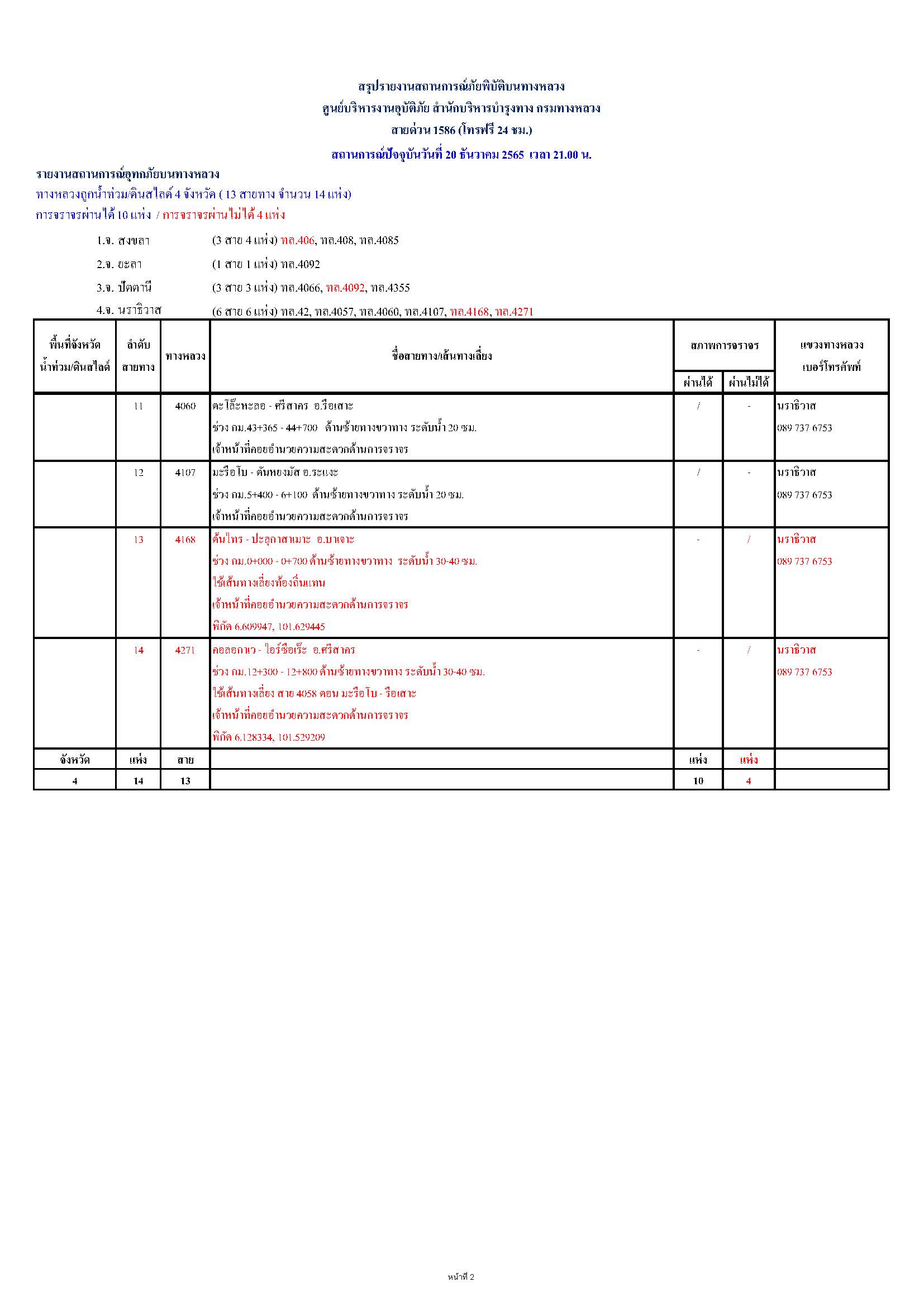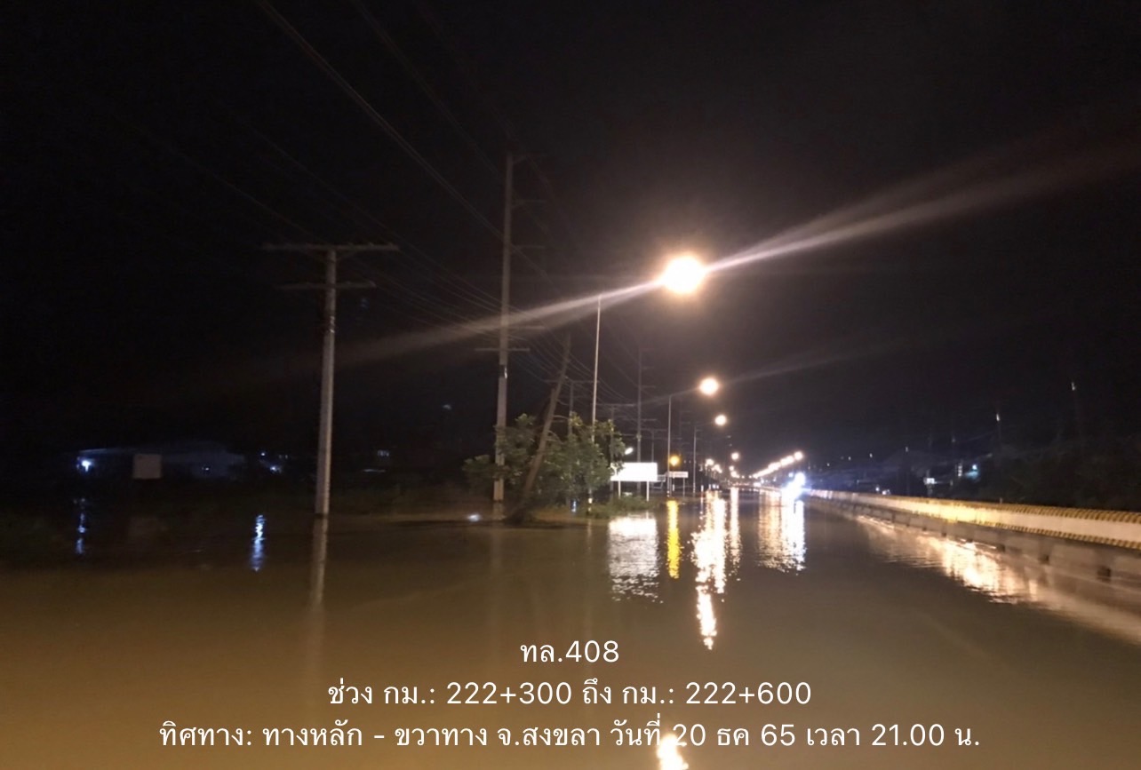 กรมทางหลวงขอรายงานสถานการณ์ น้ำท่วม และดินสไลด์ ในโครงข่ายทางหลวง วันอังคารที่ 20 ธันวาคม 2565 เวลา 21.00 น. ดังนี้