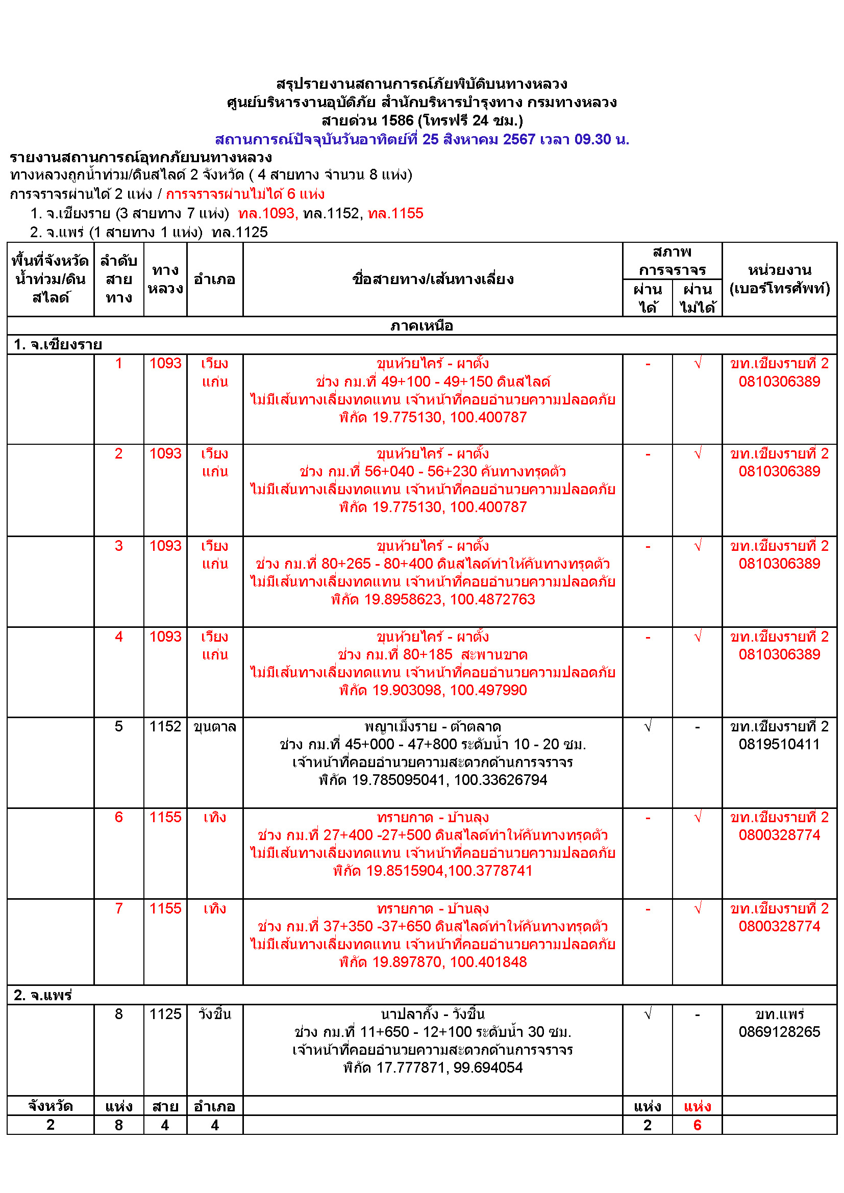 | สรุปสถานการณ์อุทกภัยบนทางหลวง วันอาทิตย์ที่ 25 สิงหาคม 2567 เวลา 09.30 น | 100 | Download |