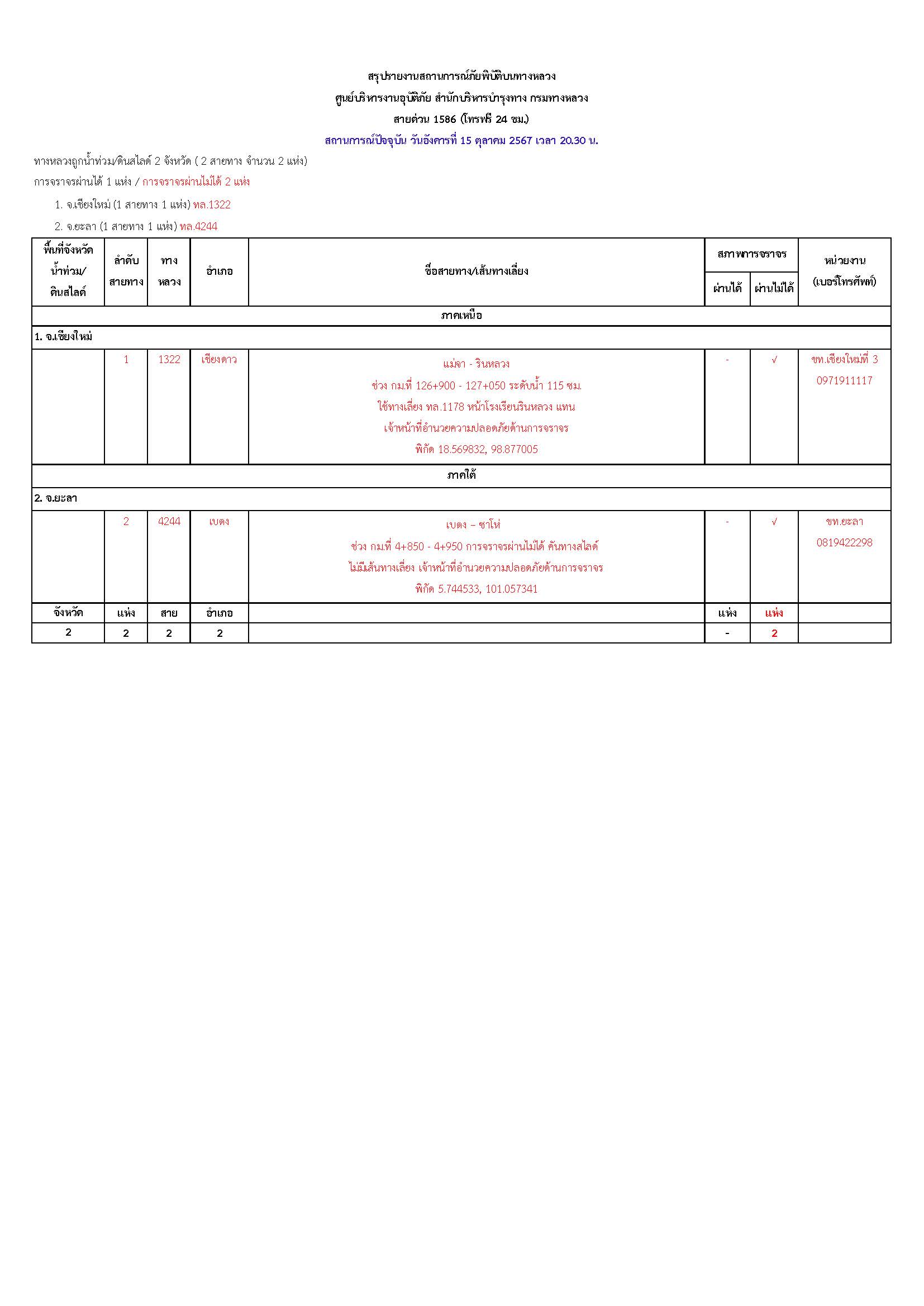 กรมทางหลวงขอรายงานสถานการณ์ น้ำท่วม และดินสไลด์ ในโครงข่ายทางหลวง