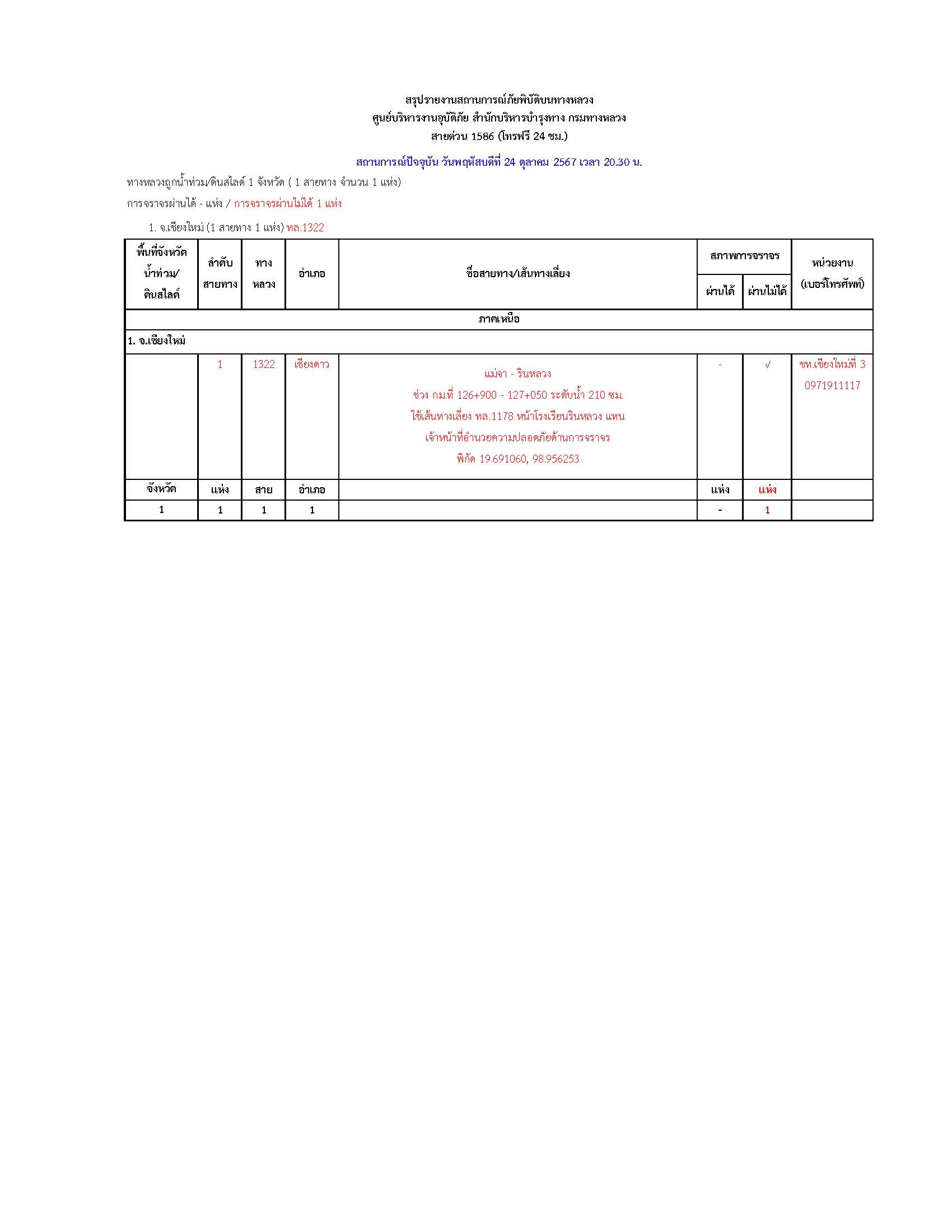 กรมทางหลวงขอรายงานสถานการณ์ น้ำท่วม และดินสไลด์ ในโครงข่ายทางหลวง