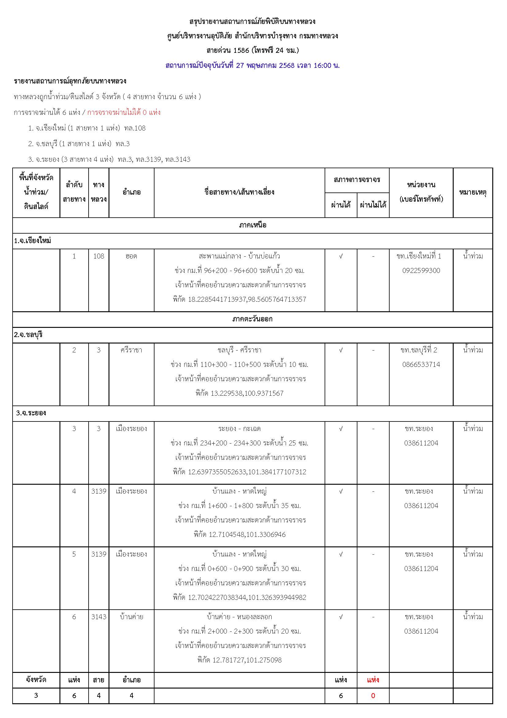 กรมทางหลวงขอรายงานสถานการณ์ น้ำท่วม และดินสไลด์ ในโครงข่ายทางหลวง