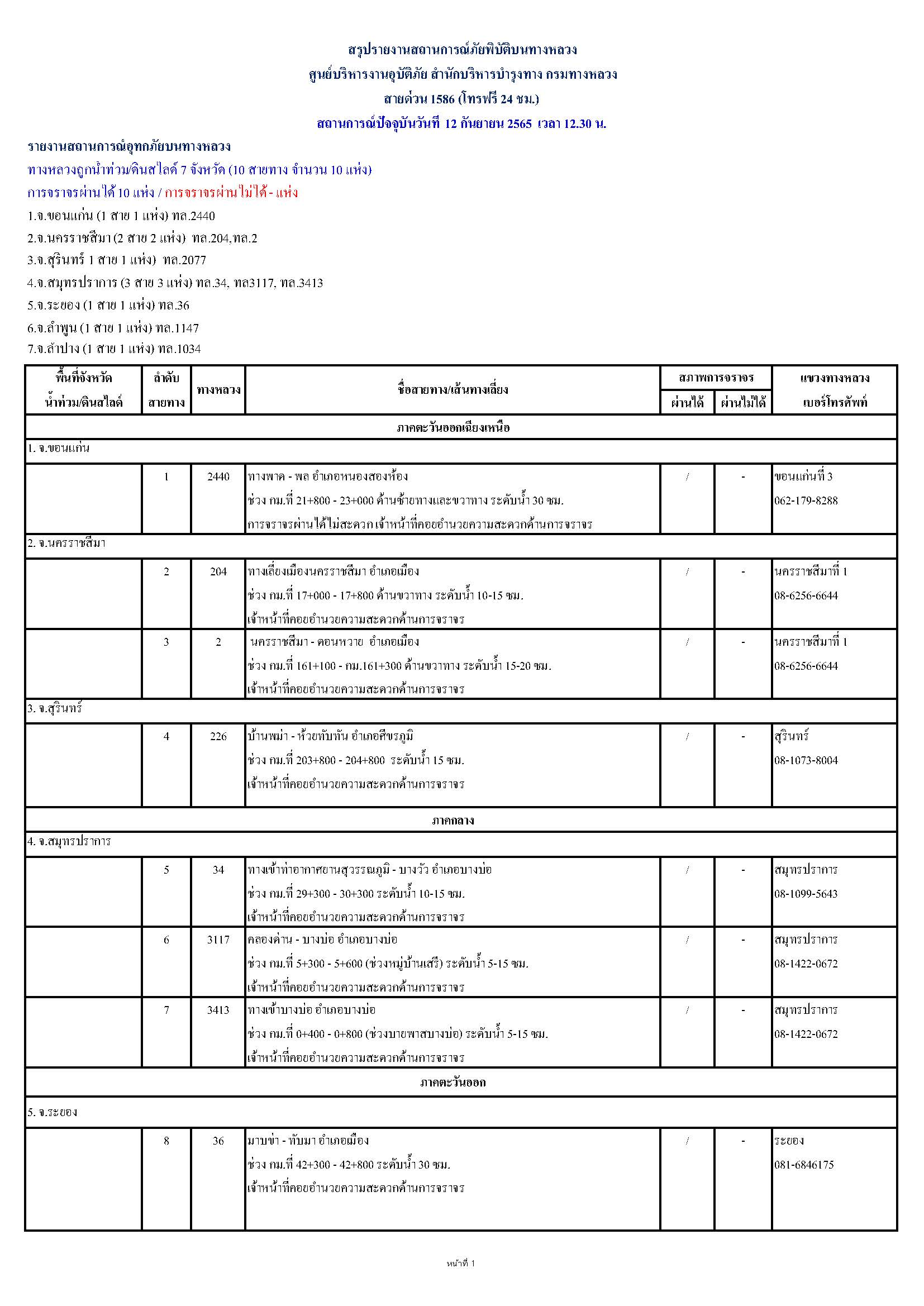 กรมทางหลวงขอรายงานสถานการณ์ น้ำท่วม และดินสไลด์ ในโครงข่ายทางหลวง วันจันทร์ที่ 12 กันยายน 2565 เวลา 12.30 น. ดังนี้