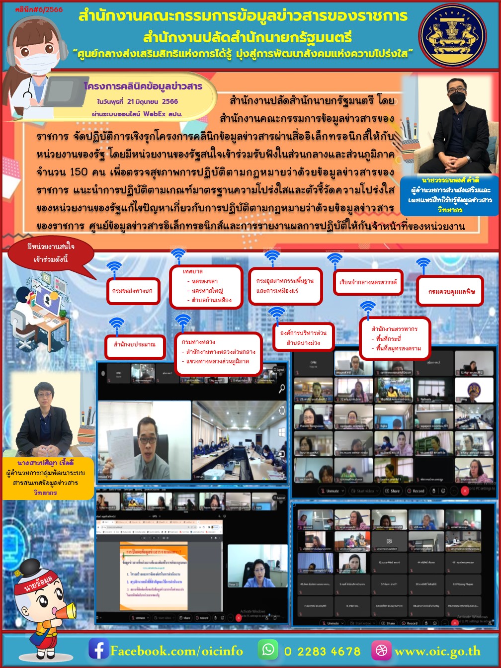 เมื่อวันที่ 21 มิถุนายน 2566 สำนักงานปลัดสำนักนายกรัฐมนตรี โดยสำนักงานคณะกรรมการข้อมูลข่าวสารของราชการ จัดปฏิบัติการเชิงรุกโครงการคลินิกข้อมูลข่าวสาร ครั้งที่ 6/2566 ผ่านสื่ออิเล็กทรอนิกส์ให้กับหน่วยงานของรัฐ โดยมีเจ้าหน้าที่ของกรมทางหลวงส่วนกลาง และส่วนภูมิภาค เข้าร่วมรับฟังจำนวน 99 คน และมีหน่วยงานรัฐเข้าร่วมการรับฟัง ประกอบด้วย สำนักงบประมาณ กรมการขนส่งทางบก กรมอุตสาหกรรมพื้นฐานและการเหมืองแร่ กรมควบคุมมลพิษ สำนักงานสรรพากรพื้นที่จังหวัดกระบี่และพื้นที่จังหวัดสมุทรสงคราม เรือนจำกลางนครสวรรค์ เทศบาลนครสงขลา เทศบาลนครหาดใหญ่ เทศบาลตำบลก้านเหลืองและองค์การบริหารส่วนตำบลบางม่วง